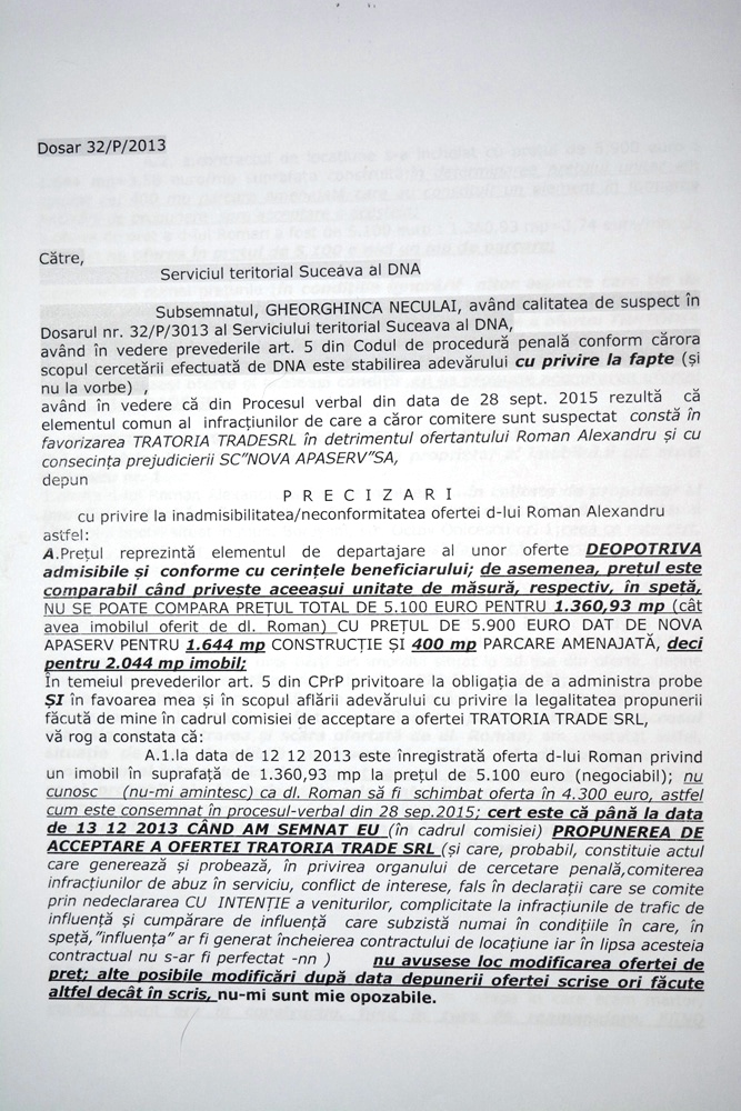 Luni, Neculai Gheorghincă, suspect în dosarul deschis de DNA Suceava pe seama strămutării sediului SC Nova Apaserv SA, a depus la anchetatori un document cu precizări. În respectivul act fostul director adjunct al companiei de apă și canalizare arată că, în realitate, clădirea oferită de Alexandru Roman avea doar 1.350,93 mp, în timp ce spațiul de la Tratoria 1.644 mp plus 400 mp de parcare amenajată, cumulat deci 2.044 mp, ceea ce însemna că, în real, metrul pătrat de la fosta clădire a Ascon era de fapt mai scump. Fostul șef de la SC Nova Apaserv SA mai arată, printre altele, că Alexandru Roman nu era singurul proprietar al spațiului și că imobilul se afla într-o stare avansată de degradare, amenajarea sa pentru birouri necesitând o cheltuială importantă.
