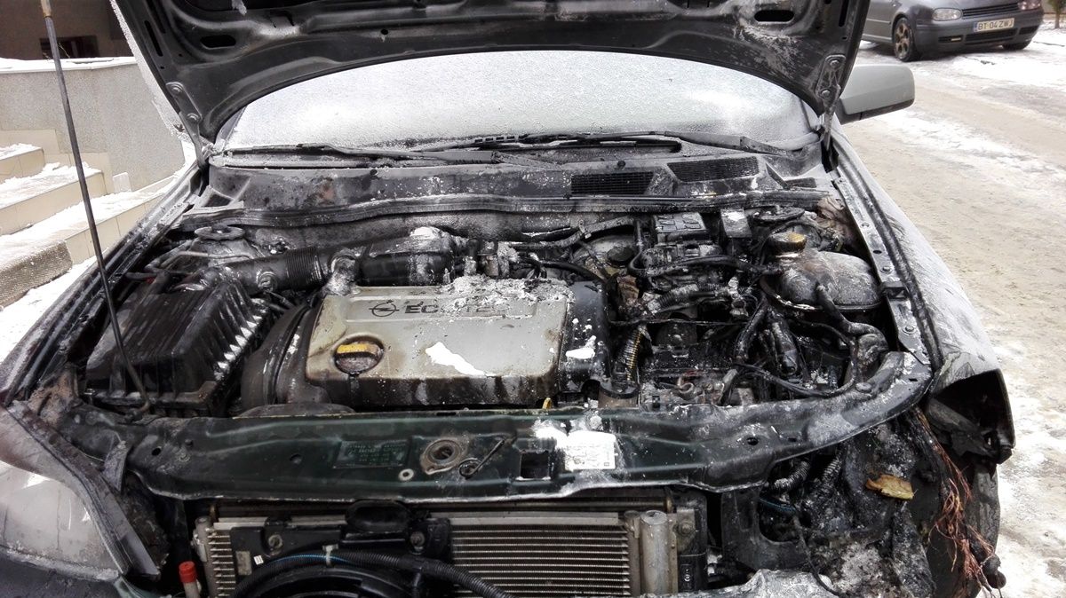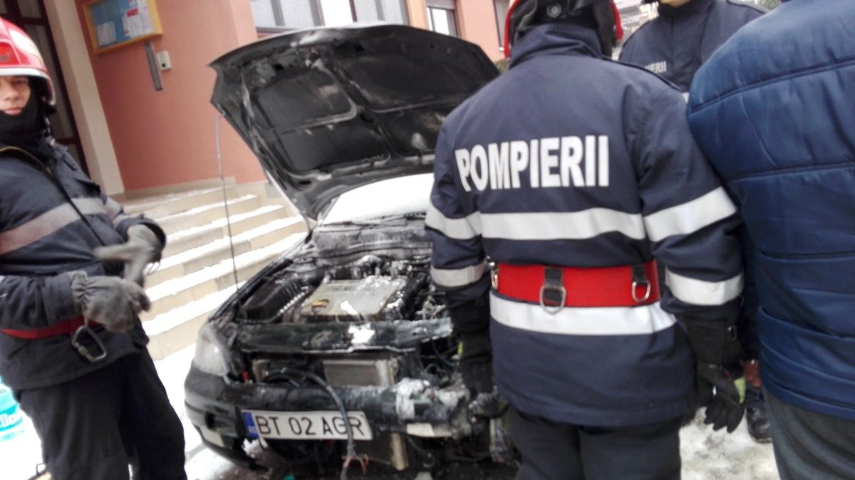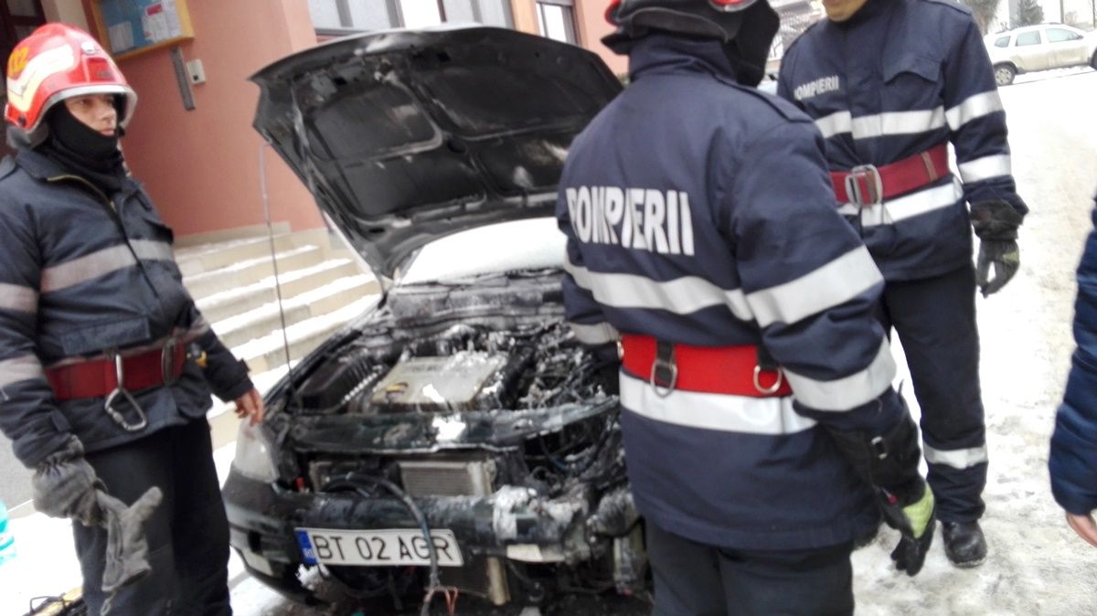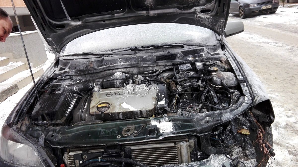 Un Opel Astra a luat foc duminică dimineața chiar în fața ușii unui bloc din municipiul Botoșani. Automobilul era parcat în cartierul Bucovina, pe o stradelă de la marginea orașului.