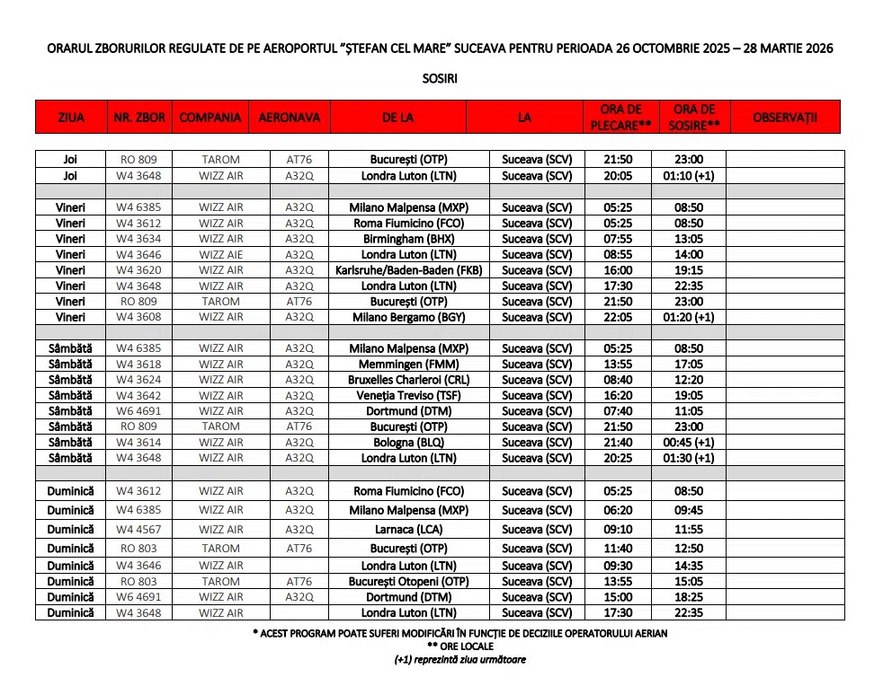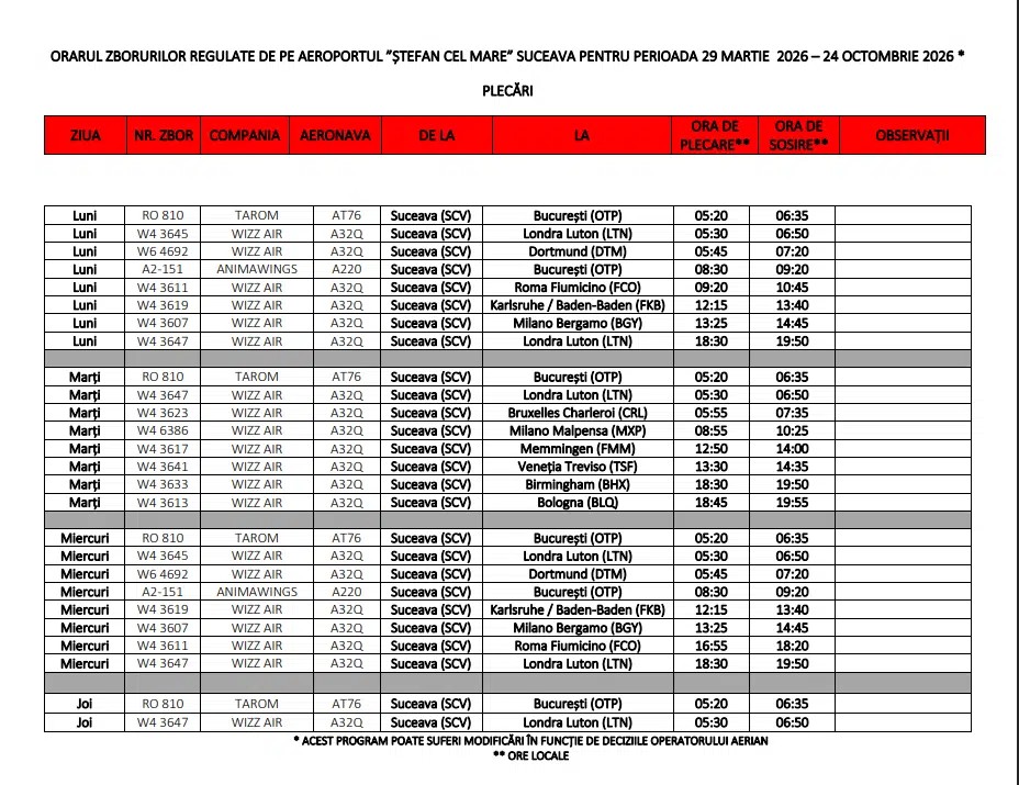 Aeroportul Internațional „Ștefan cel Mare” a definitivat calendarul zborurilor pentru intervalul 29 martie – 24 octombrie 2026.