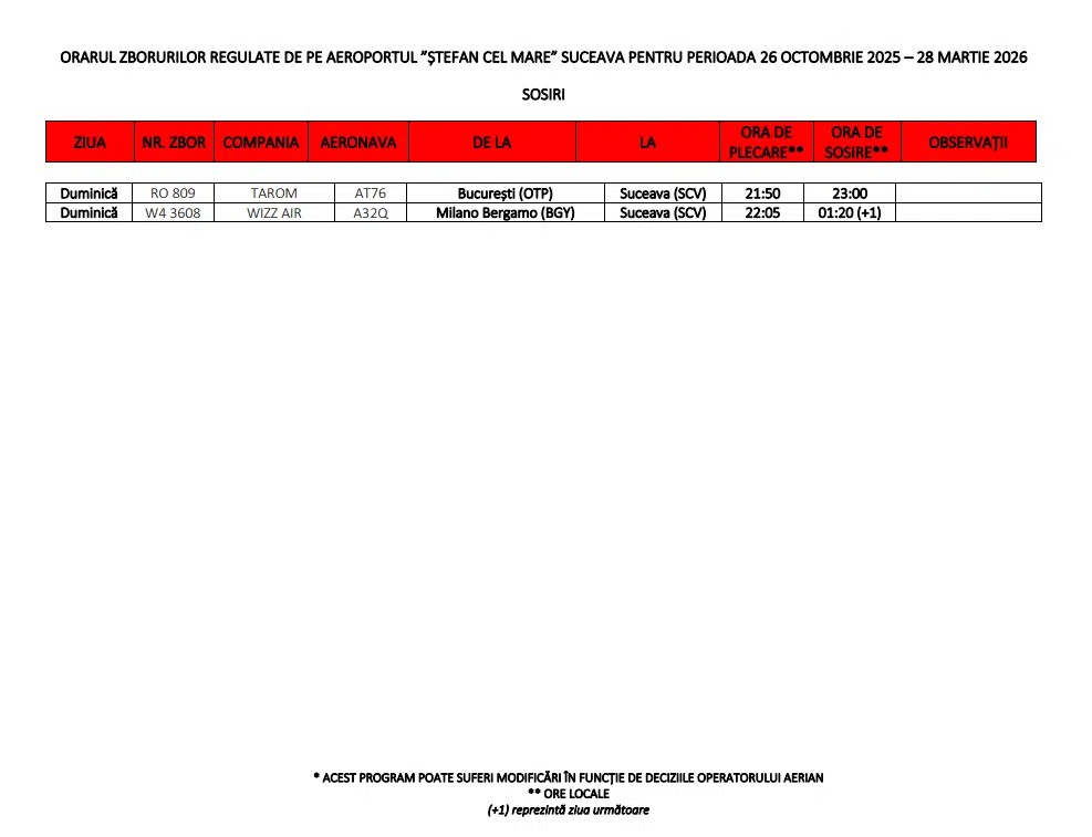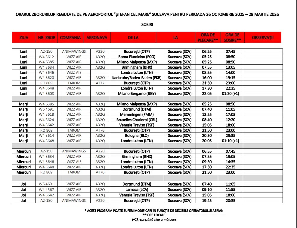 Principala caracteristică a noului program este continuitatea. Din punct de vedere al operatorilor, piața suceveană păstrează o structură clară. Segmentul curselor externe este acoperit în totalitate de Wizz Air, în timp ce conexiunea cu Bucureștiul este asigurată prin efortul conjugat al companiilor TAROM și AnimaWings, scrie suceavalive.ro