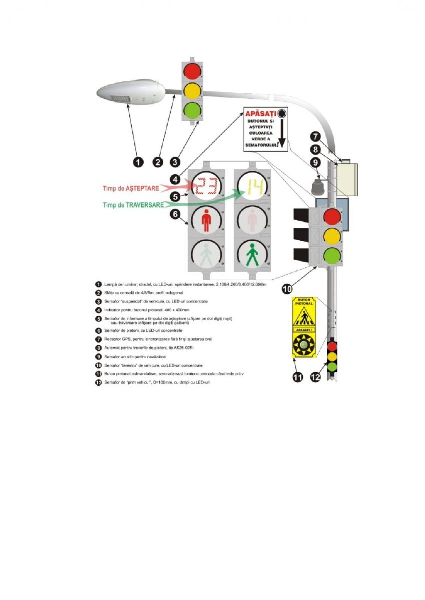 - Butoane pietonale și indicatoare prevăzute cu LED-uri verzi (luminează intermitent numai pe perioada de acțiune, până la prima apăsare. După apăsarea butoanelor, acestea se sting, indicând luarea în considerare a comenzii)