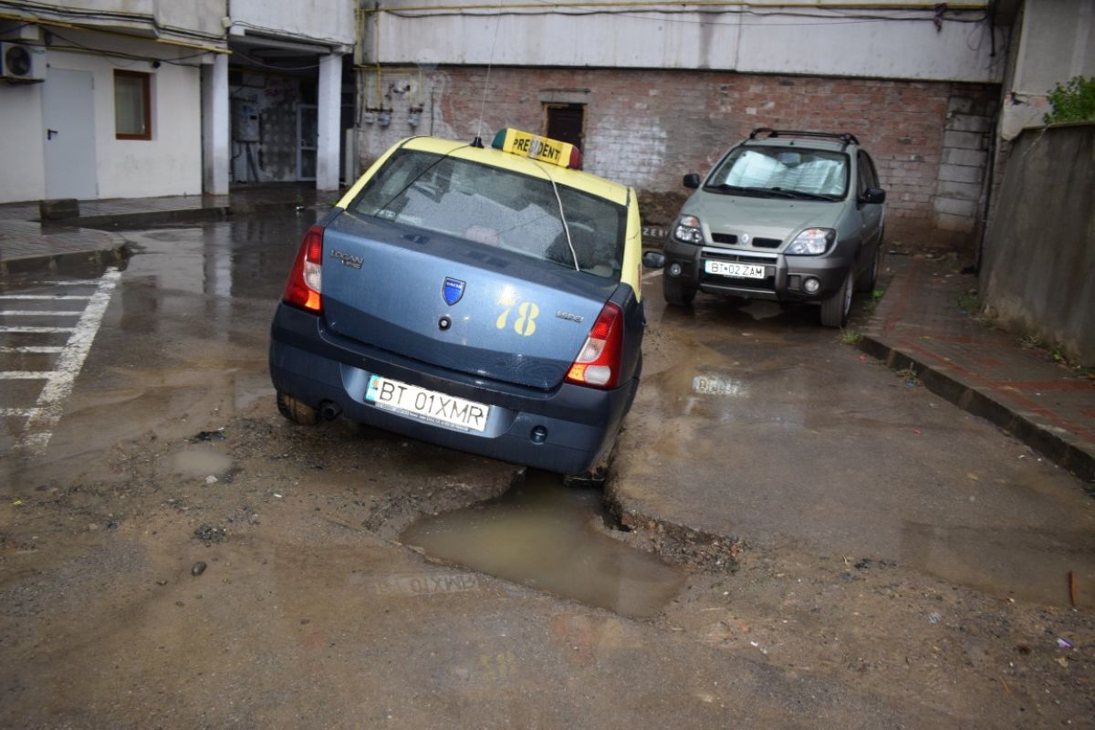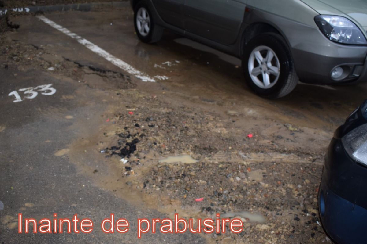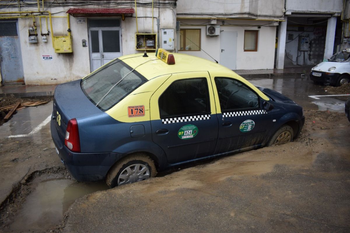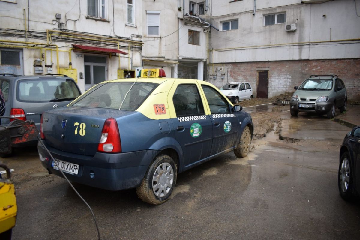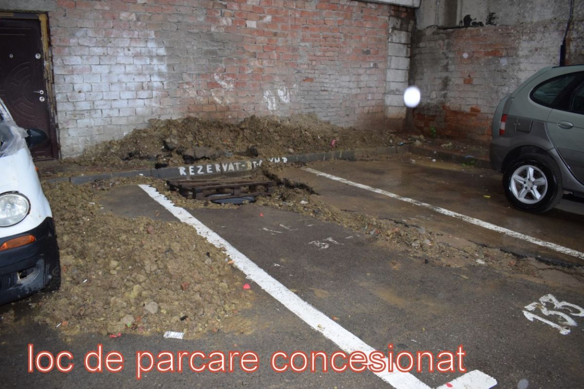 ”Dimineață la 7.30 când am vrut să plec cu fata la școală, am dat să o întorc aici, acesta este locul meu de parcare, fleoșc roata din față s-a dus. Acesta este locul meu de parcare concesionat de la Primărie, care este plătit. Când am vrut să o scot am rămas acolo. El a fost acoperit doar cu pământ și când a venit ploaia s-a dus”