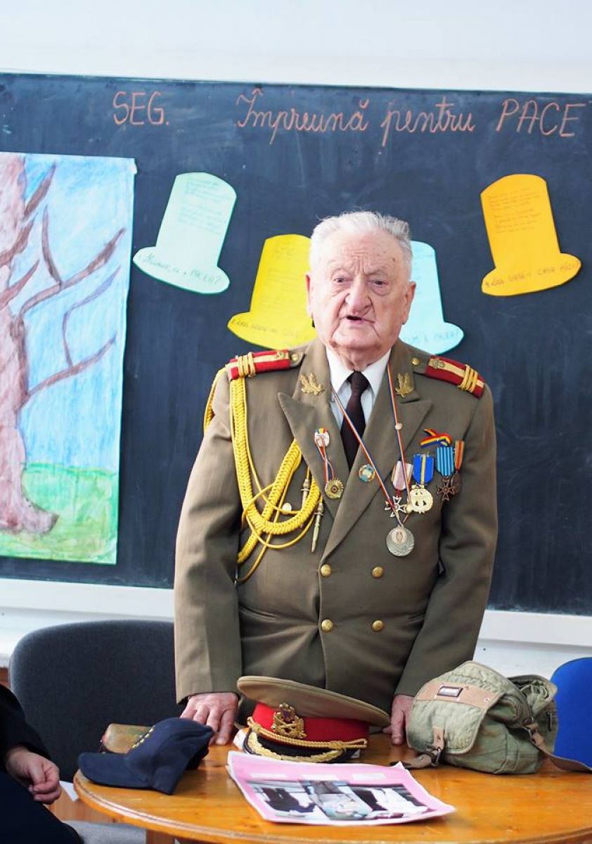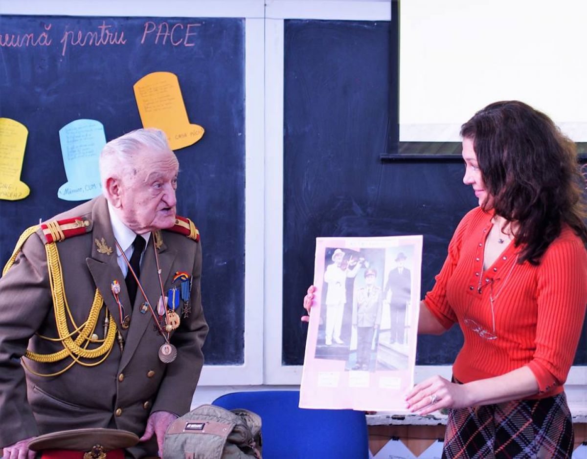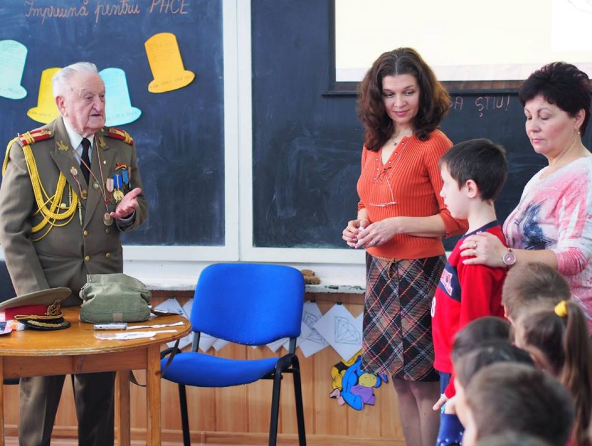 ”Ați vrut să mergeți la război?”, ”La câte bătălii ați participat?”, ”Ați fost rănit?”, ”Cu ce arme v-ați luptat?” Invitatul, având multe lupte grele la activ, a povestit copiilor, cu exemple dramatice din viața sa de ostaș, despre ororile de neînchipuit ale războiului: pierderea camarazilor pe câmpul de luptă, depărtarea de familie și de cei apropiați, mijloacele crude a a-ți ucide semenii, dorința de a-ți apăra țara și speranța de a scăpa cu viață. În final, a conchis că războiul este un lucru dureros și inuman, iar pacea e bună pentru că asigură condiții pentru împlinirea și fericirea semenilor.