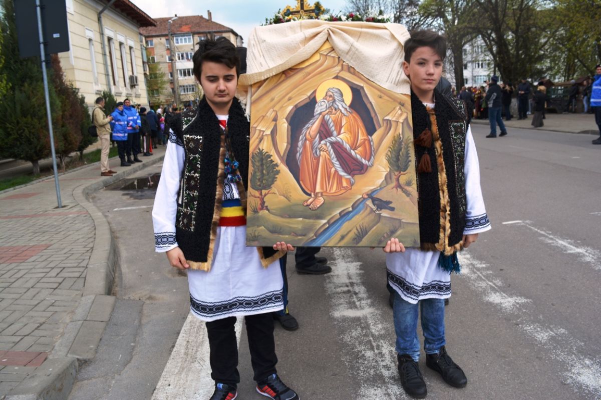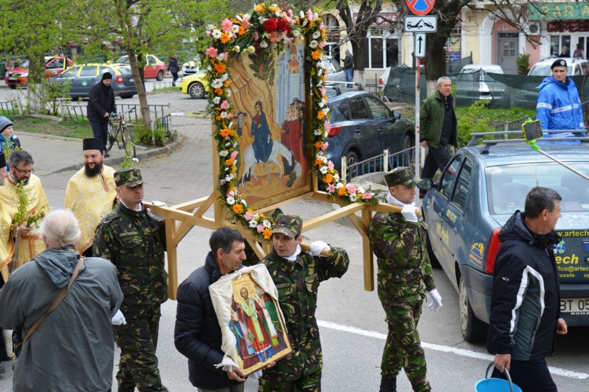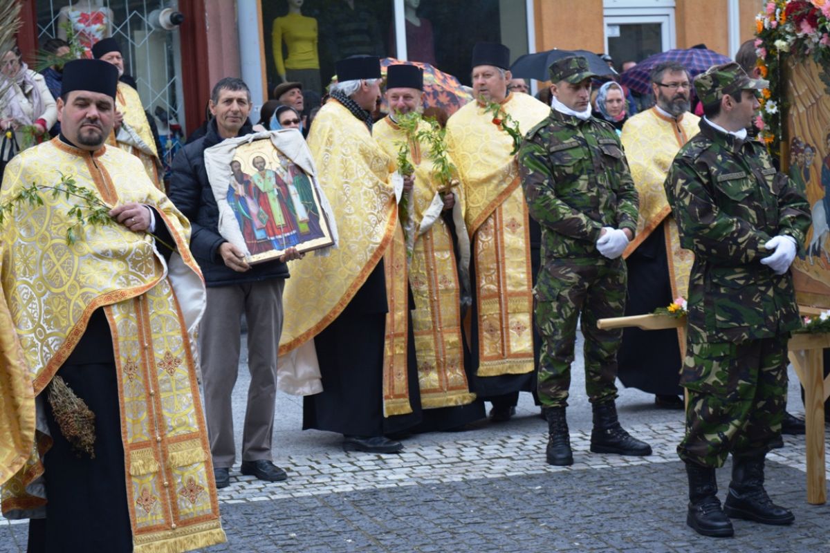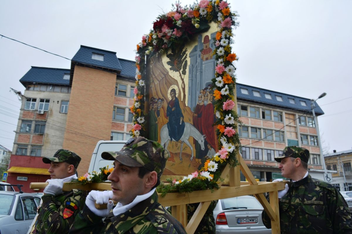 Icoana care simbolizează intrarea Mântuitorului în Ierusalim a fost purtată de patru militari, în timp ce unii participanți la procesiune au venit îmbrăcați în straie populare.
