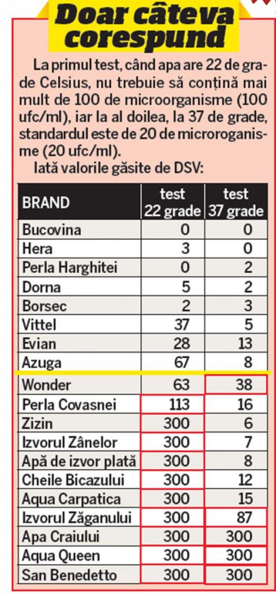 Trei dintre ele depăşesc limita admisă de 15 ori, adică colcăie de microorganisme.Din punct de vedere tehnic, testul se referă exclusiv la numărul de bacterii conţinut de un mililitru de apa plată de băut, test repetat de două ori: odată la temperatura de 22 de grade Celsius, apoi la 37 de grade Celsius. La primul test apa nu trebuie să conţină mai mult de 100 de microorganisme (100 ufc/ml), iar la al doilea, standardul este de 20 de microroganisme (20 ufc/ml).