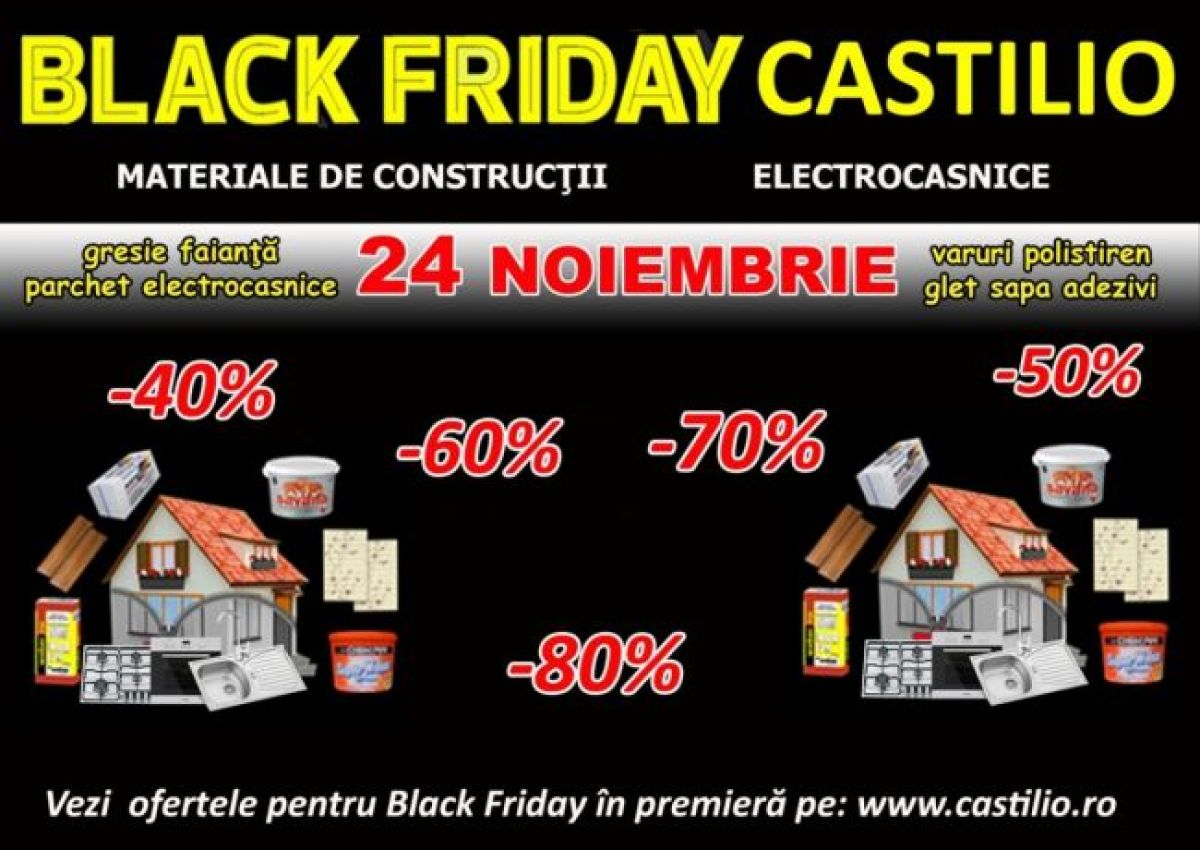 Castilio anunţă reduceri colosale o singură zi pe an: Black Friday 24 noiembrie 2017. Reducerile care vor fi valabile DOAR vineri, 24.11.2017, în intervalul orar 07:00-18:00, vor fi aplicate următoarelor produse: varuri lavabile, gresie, faianţă, parchet, gleturi, şape, adezivi, tapet, finisaje decorative, vopsele, amorse, tencuieli, vată minerală, electrocasnice şi multe alte materiale de construcţii.