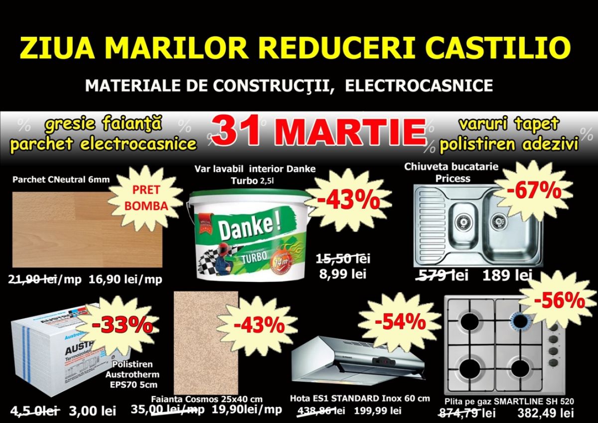 Printre promoţiile oferite de către Castilio la Ziua Marilor Reduceri, enumarăm: chiuveta de bucătărie inox Princess Teka, calitate nemţească, cu - 67% la doar 189 lei; varul lavabil Danke Turbo 2,5l cu - 43% la doar 8,9 lei; amorsa Danke 4L cu - 40% la doar 7,9 lei; polistirenul expandat Austrotherm EPS70 5cm cu -33% la doar 3 lei/bucată; parchetul Neutral 6mm la doar 16,90 lei/mp; parchetul laminat Galant 8 mm, fabricaţie Germania, la 21,90 lei/mp; faianţa Beta la doar 15,90 lei/mp; bateria de bucătărie granit Minuet cu -57% la doar 99,99 lei; hota inox Pyramis cu -54% la doar 199,99 lei; plita incorporabilă pe gaz Pyramis cu -56% la doar 382,49 lei; cuptorul incorporabil Pyramis cu - 61% la doar 890 lei; cuptorul cu microunde Daewoo Retro KOR-6LBRC, 20l, 800 W la doar 288,15 lei; setul format din chiuvetă şi baterie de bucătărie Pyramis cu -48% la doar 179,99 lei; galeria de lemn 3m cu -35% la doar 32,9 lei; -25% la toate modelele de tapet; -25% la toate finisajele decorative interioare de înaltă calitate San Marco; -25% la toate galeriile de lemn şi metal pentru perdele; -25% la toate baghetele de polistiren; -20% la vopsele, lacuri, scule şi accesorii de zugrăvit; vopseaua Savana Satin Rost 0,75l la doar 9,93 lei şi setul zugrav profesional cu -52% la doar 9,84 lei.