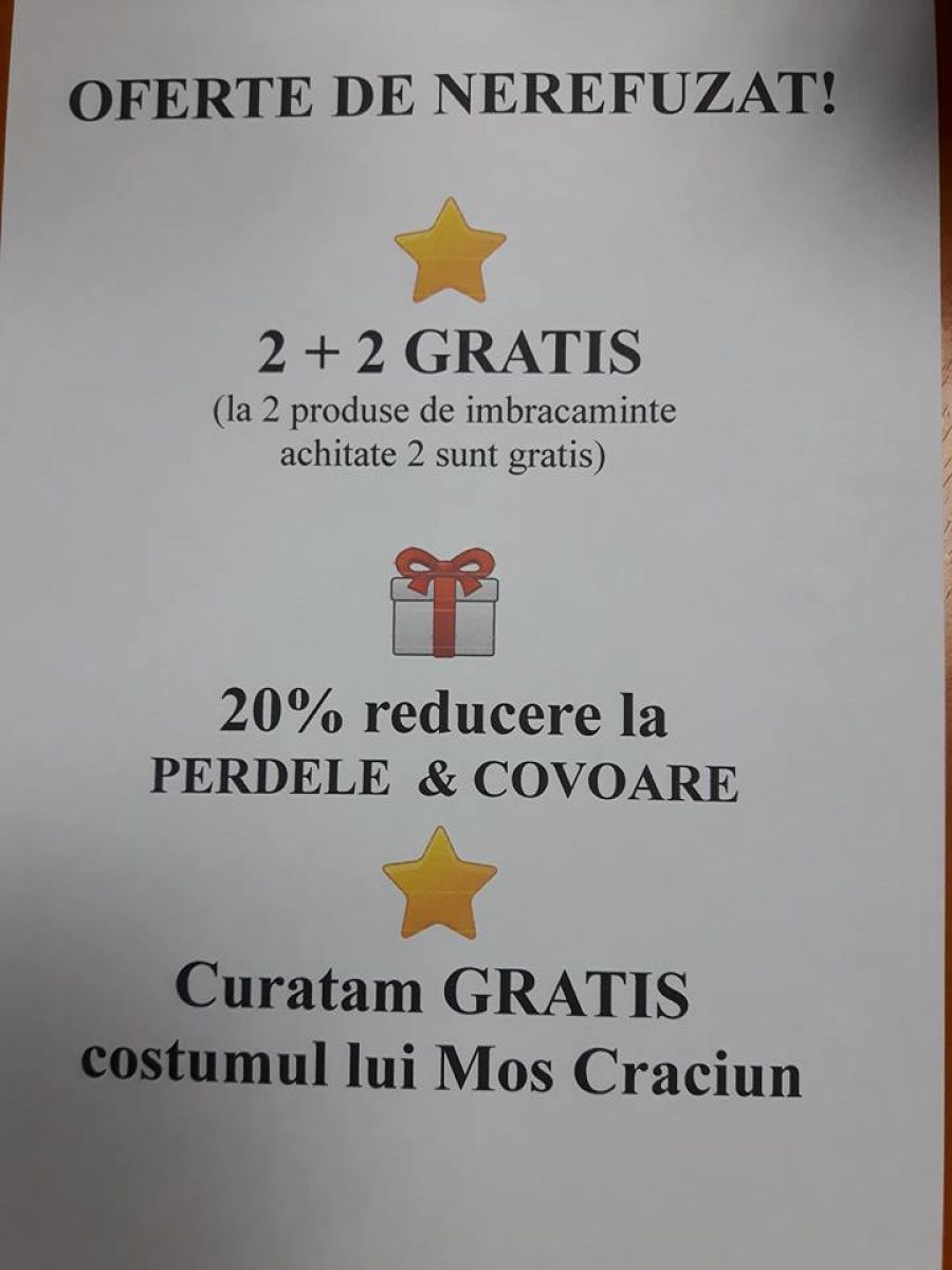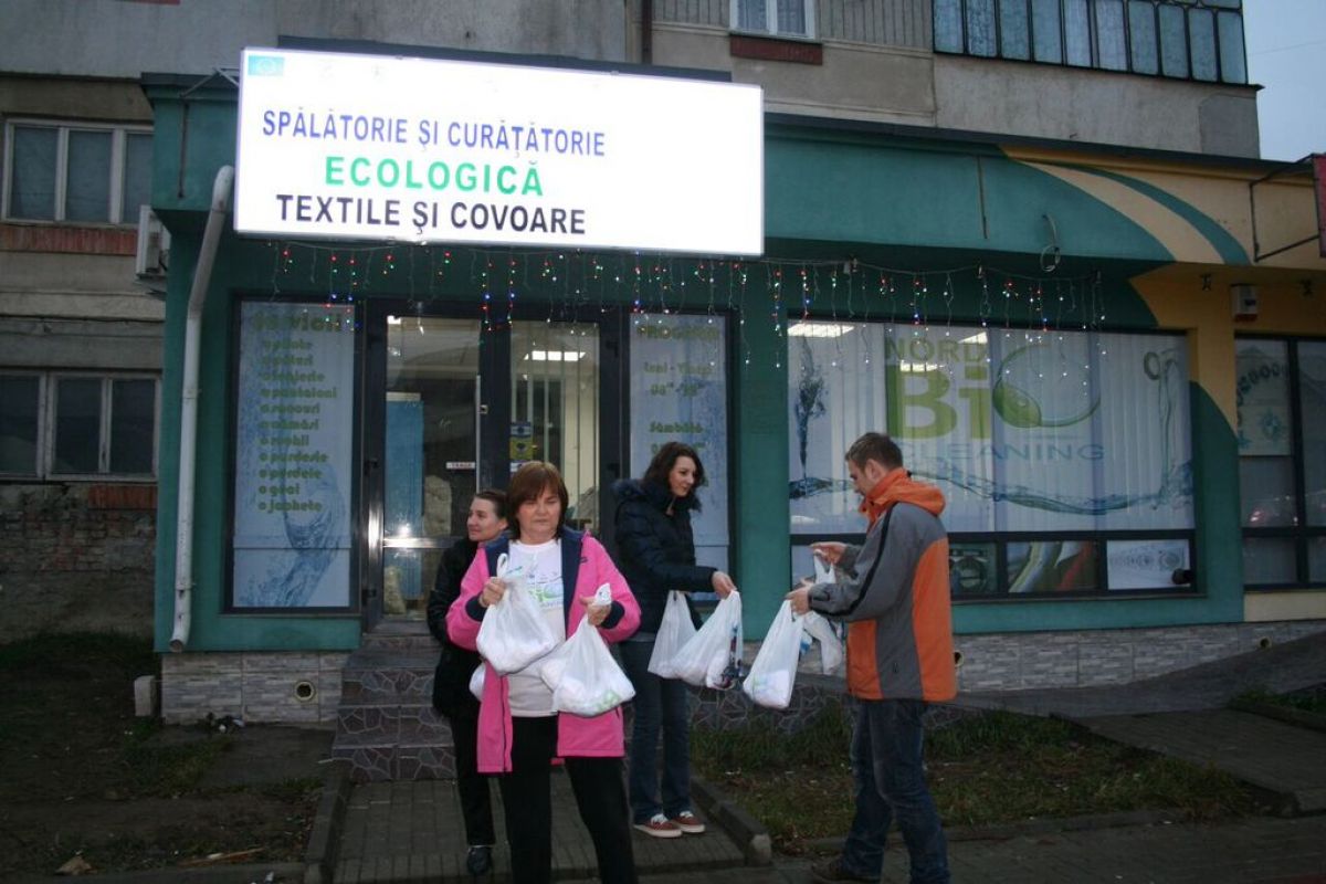 "Începând de săptămâna trecută toți clienții care trec pragul spălătoriei primesc tricouri, pixuri și agende și în ciuda faptului că avem cele mai mici prețuri, clienții sunt întâmpinați cu trei oferte de nerefuzat: la 2 produse achitate, 2 sunt GRATIS, la covoare și perdele oferim o reducere de 20% și curățăm gratuit costumul lui Moș Crăciun", afirmă Anca Pâslaru, manager Bio Cleaning Nord.