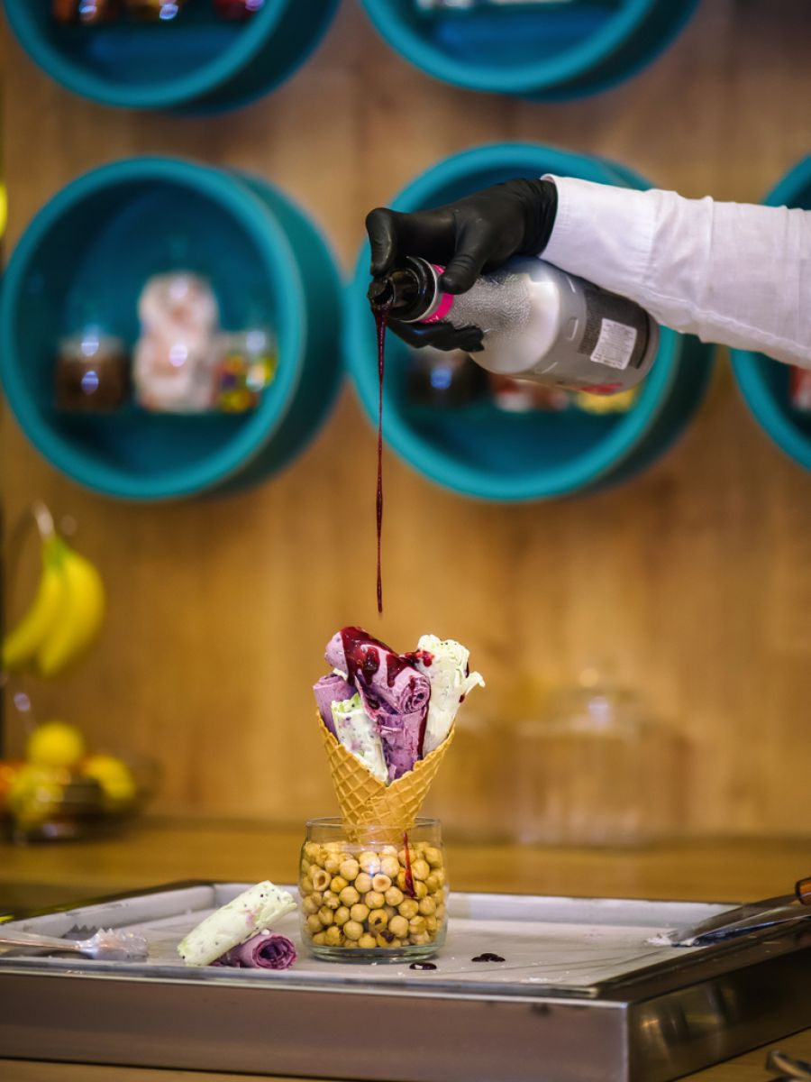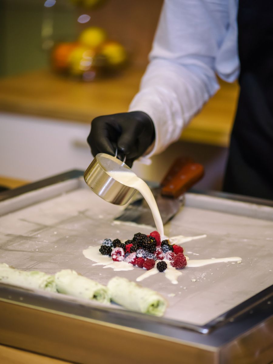 Și nu oricum, pentru că Thet îi îndeamnă să descopere arta preparării înghețatei thailandeze, un adevărat spectacol de tehnici și arome, direct în fața clientului.