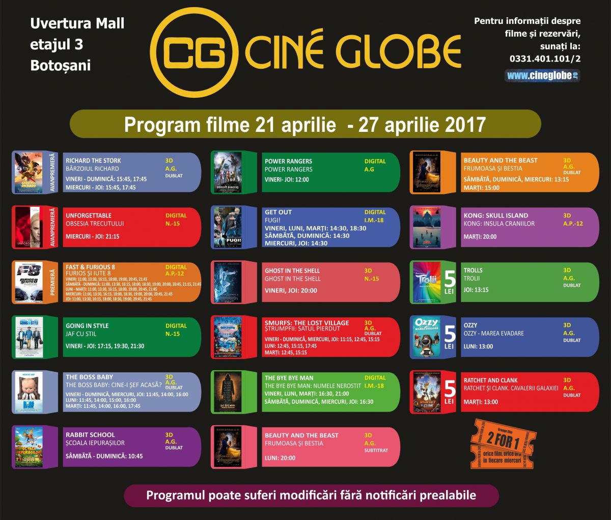 Botoșănenii iubitori de film se pot delecta în perioada 21 aprilie – 27 aprilie la Cine Globe, din incinta Uvertura Mall, cu noi pelicule care vor fi proiectate în avanpremieră.