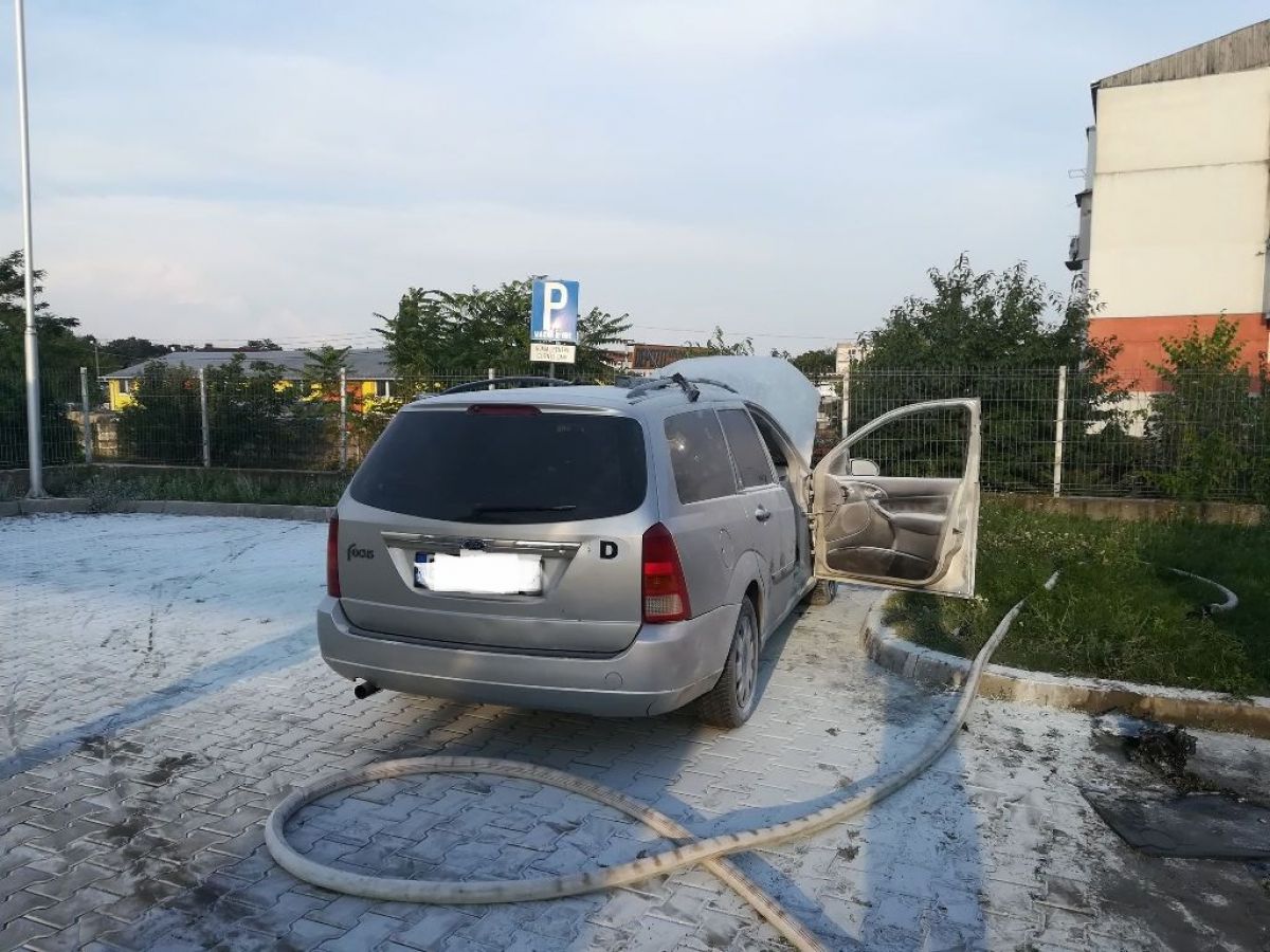 Este vorba de un Ford care se afla în apropierea spălătoriei. Din maşină ieşea mult fum, cu precădere din zona capotei.