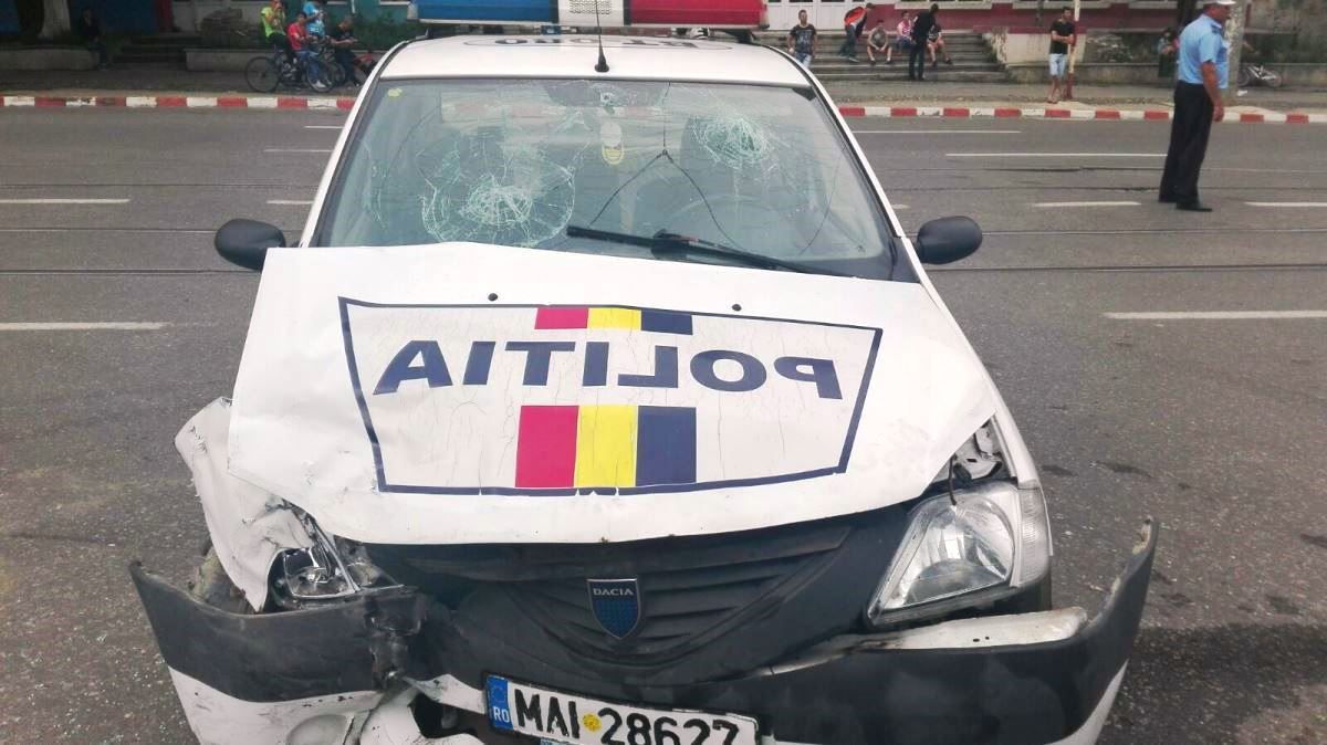 Parbrizul Daciei Logan a Inspectoratului de Poliție Județean implicată în accidentul rutier care a avut loc duminică după-amiază pe Calea Națională s-a spart în două locuri.