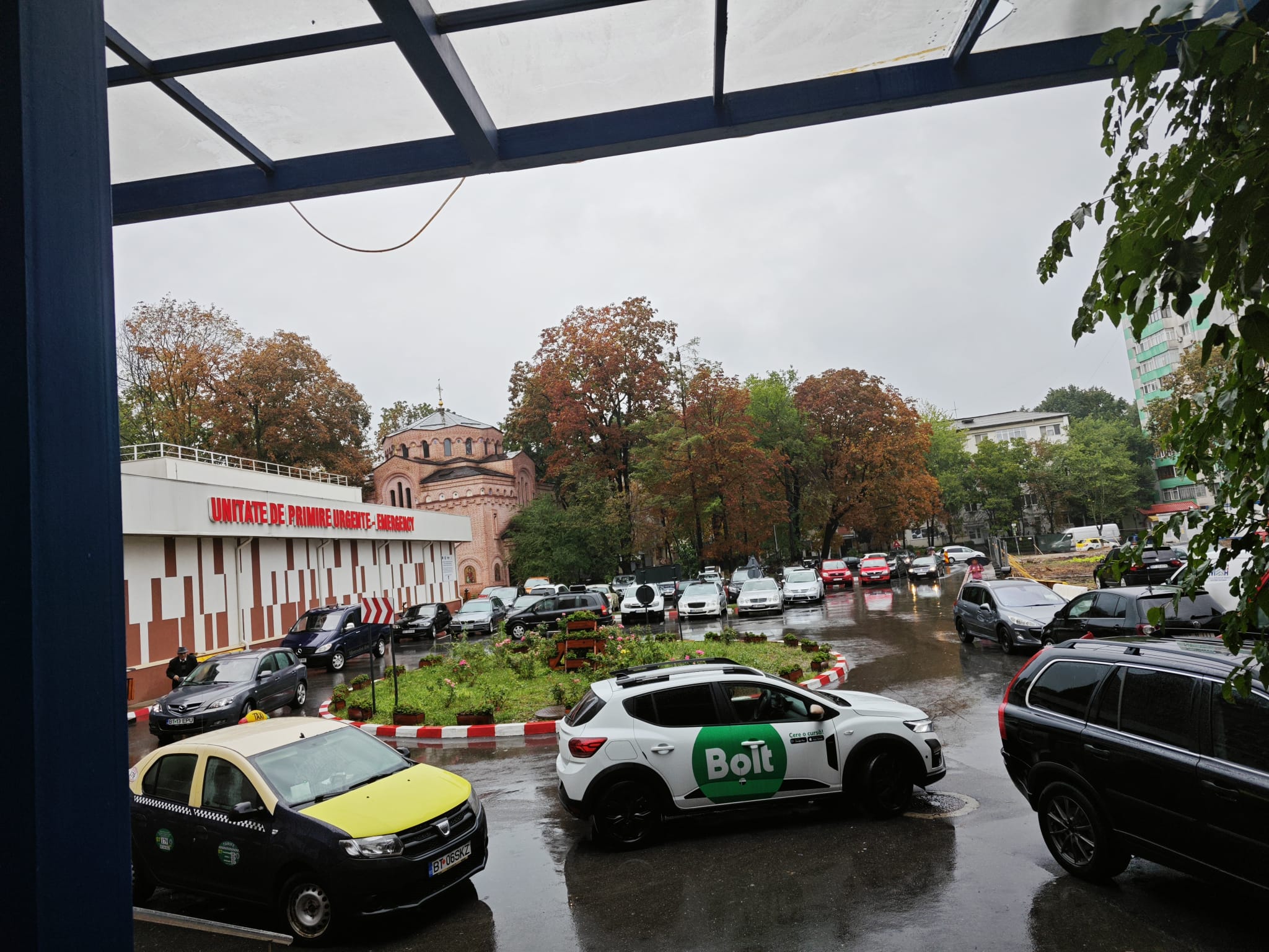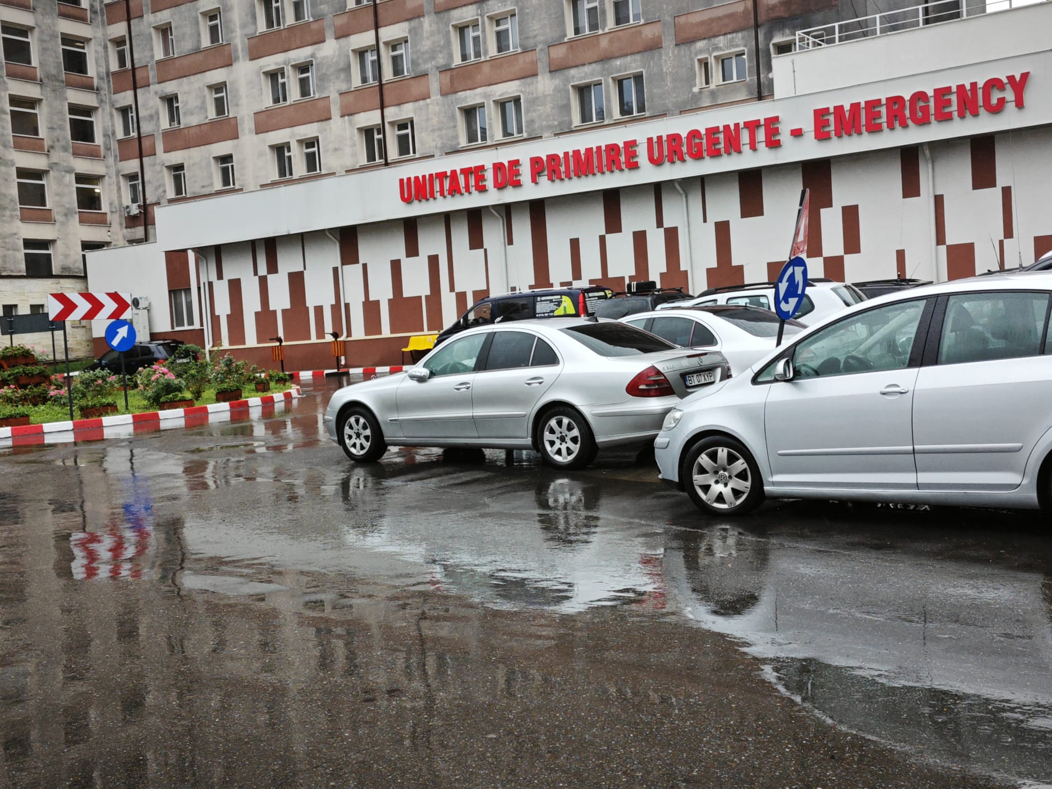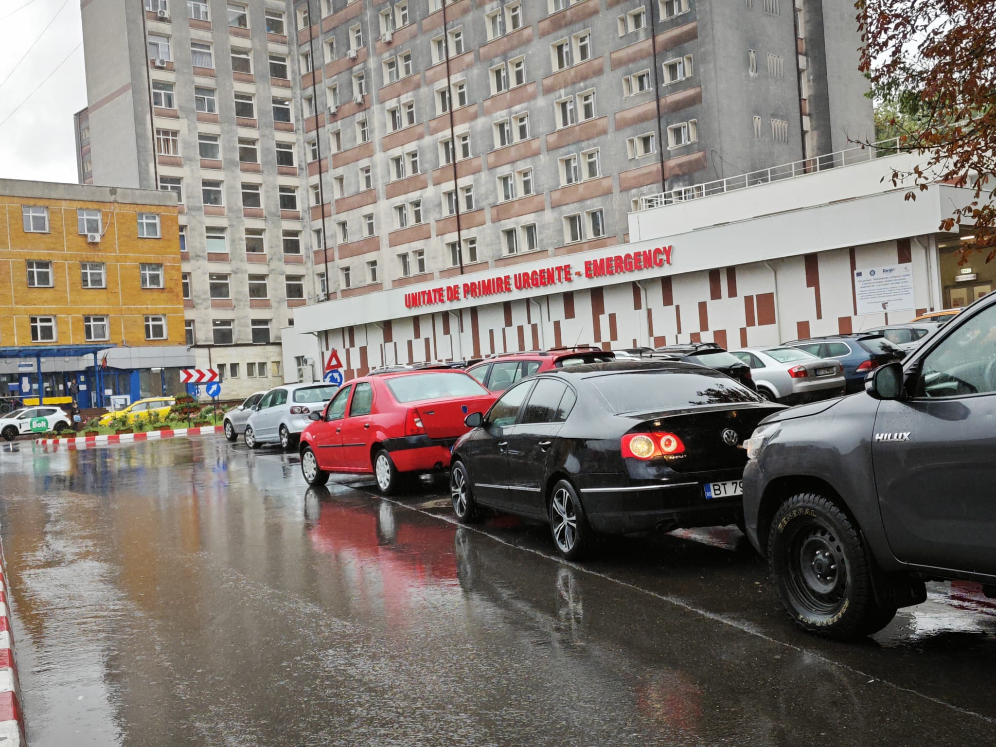 Afară plouă puternic, astfel că șoferii își pot lăsa mașinile în curtea unității sanitare.