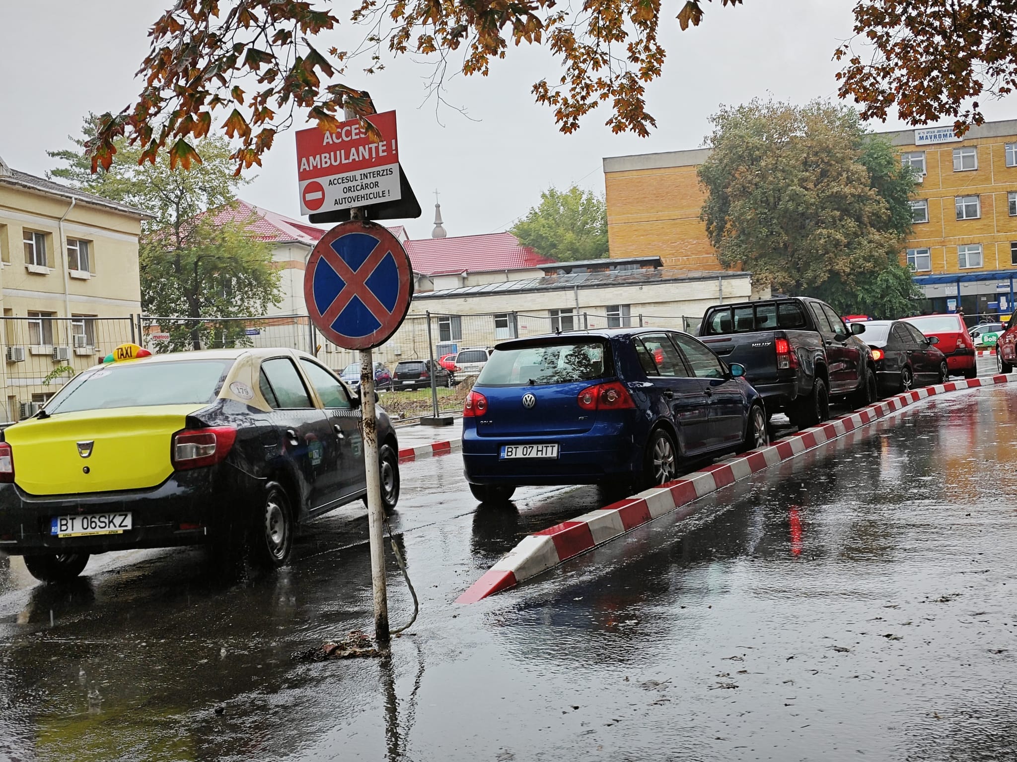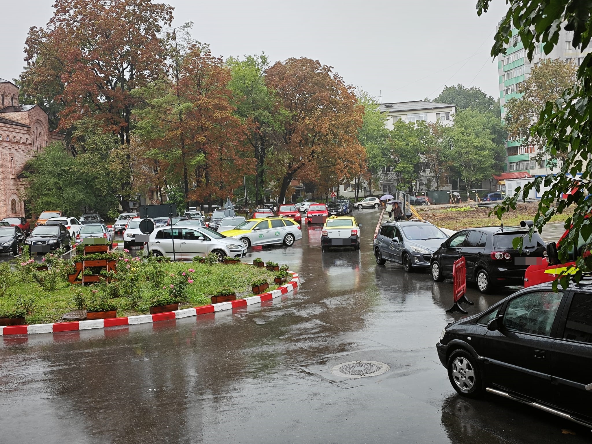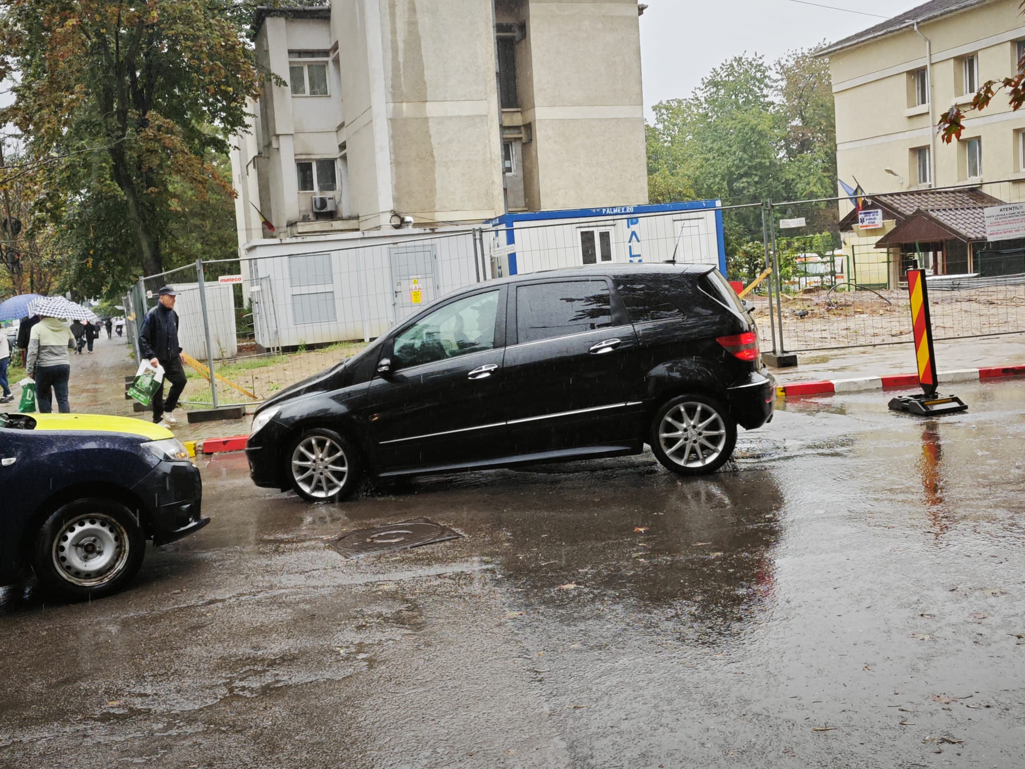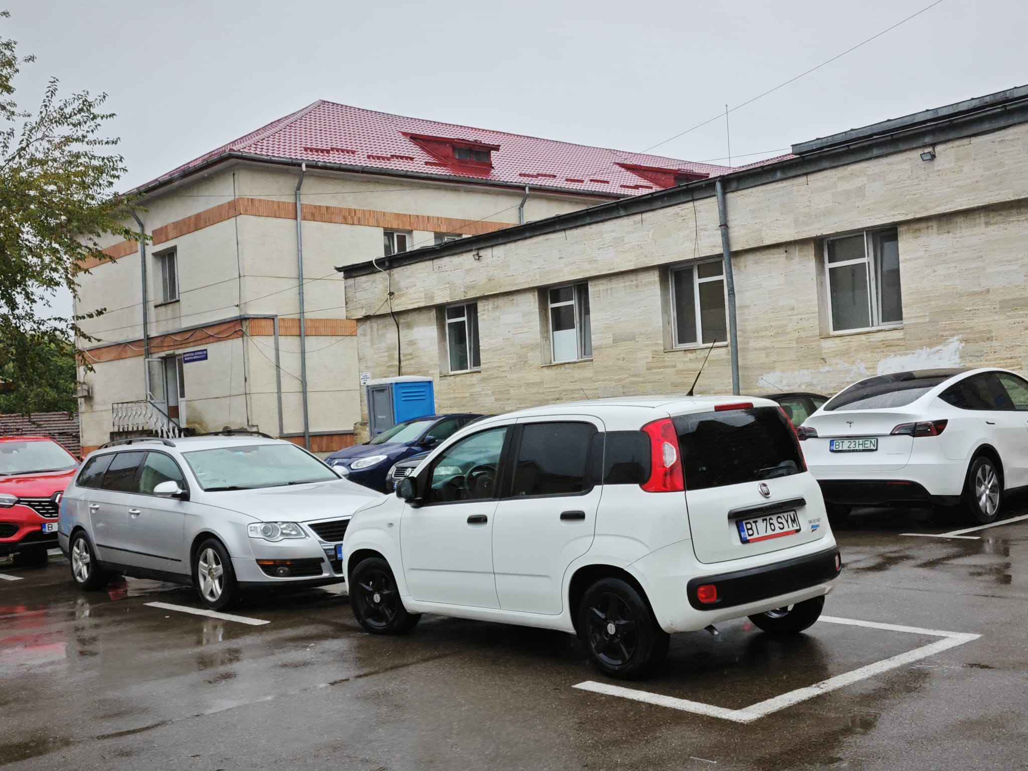 Afară plouă puternic, astfel că șoferii își pot lăsa mașinile în curtea unității sanitare.