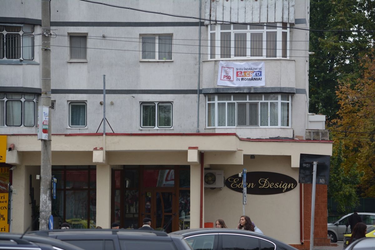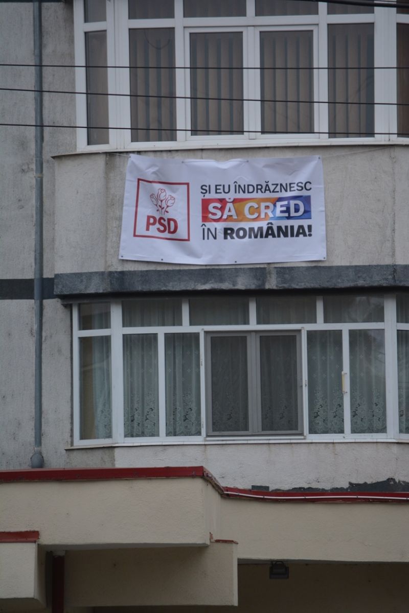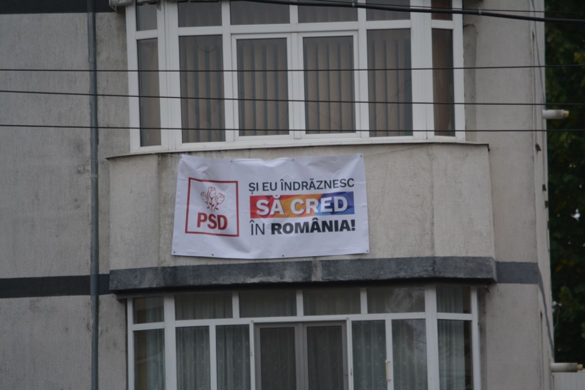 Pe lângă ALDE și PMP, PSD-ul este la rândul său prezent pe panourile electronice și nu numai. Pe la balcoane și-au făcut apariția bannere cu sigla partidului și mesajul ”Și eu îndrăznesc să cred în România” scris pe un tricolor.