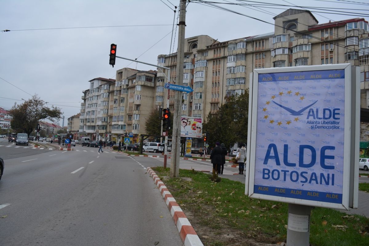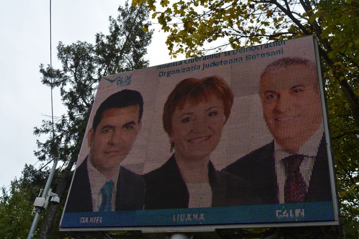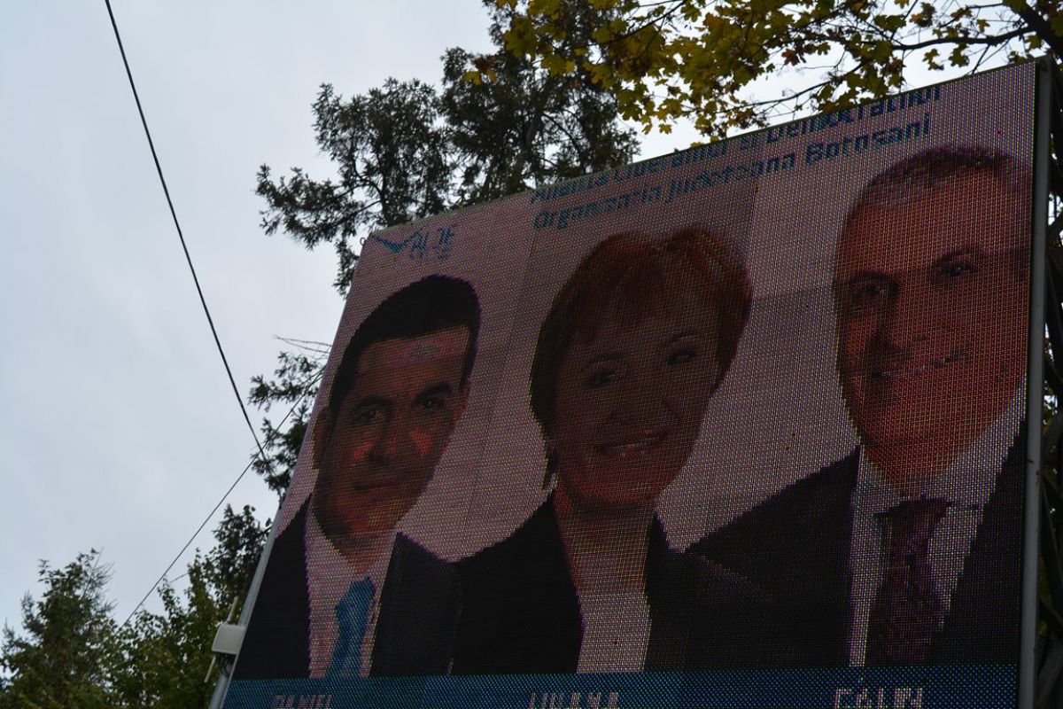 ”Daniel, Liliana, Călin”, iar deasupra lor ”Alianța Liberalilor și Democraților – Organizația județeană Botoșani”. De pe un panou electric de la intersecția dintre Marchian și bulevardul George Enescu liderii ALDE ne zâmbesc încrezători de câteva zile.