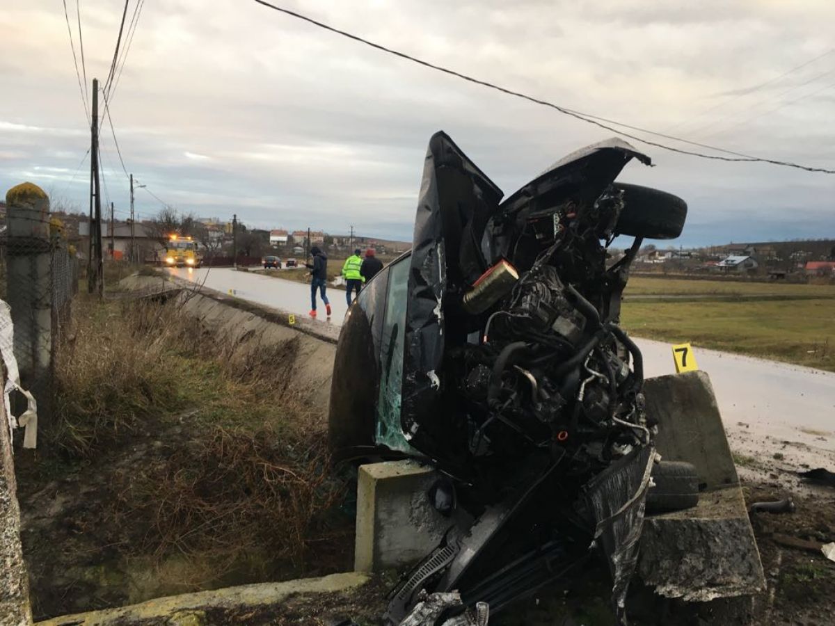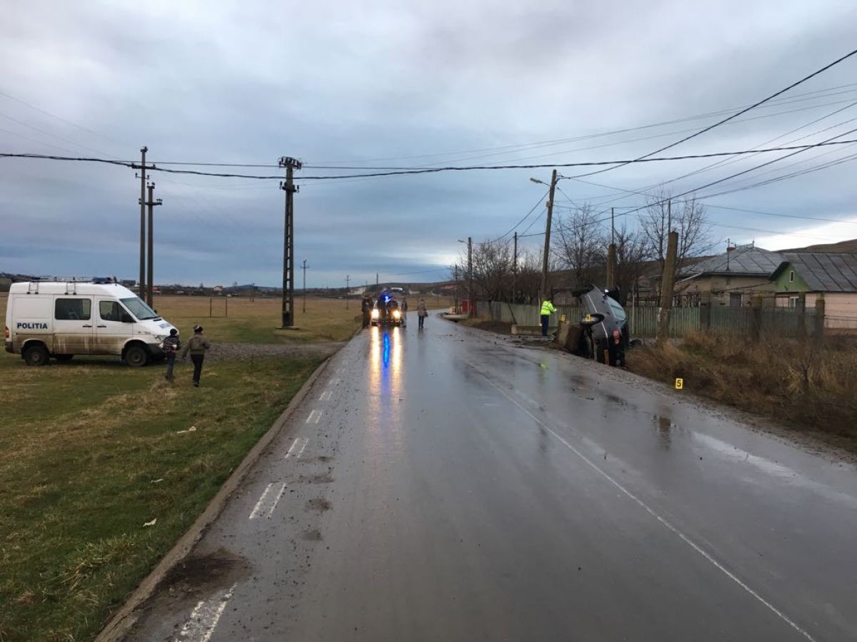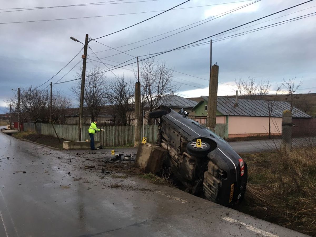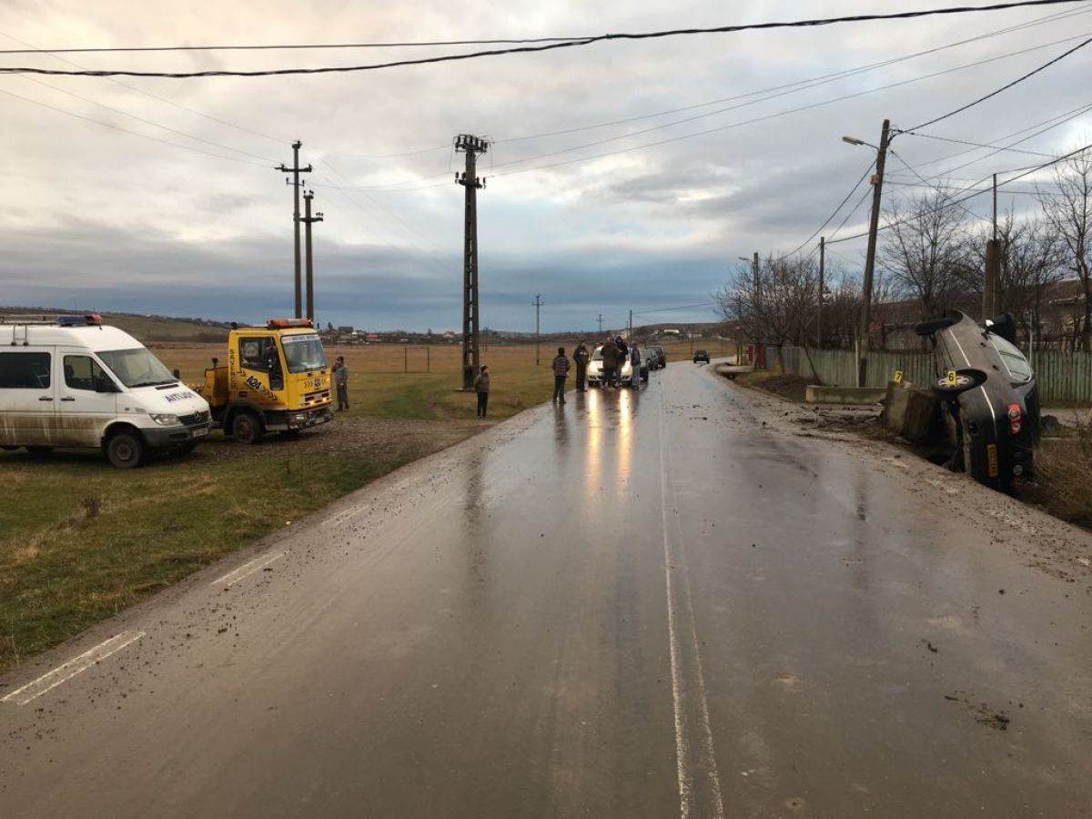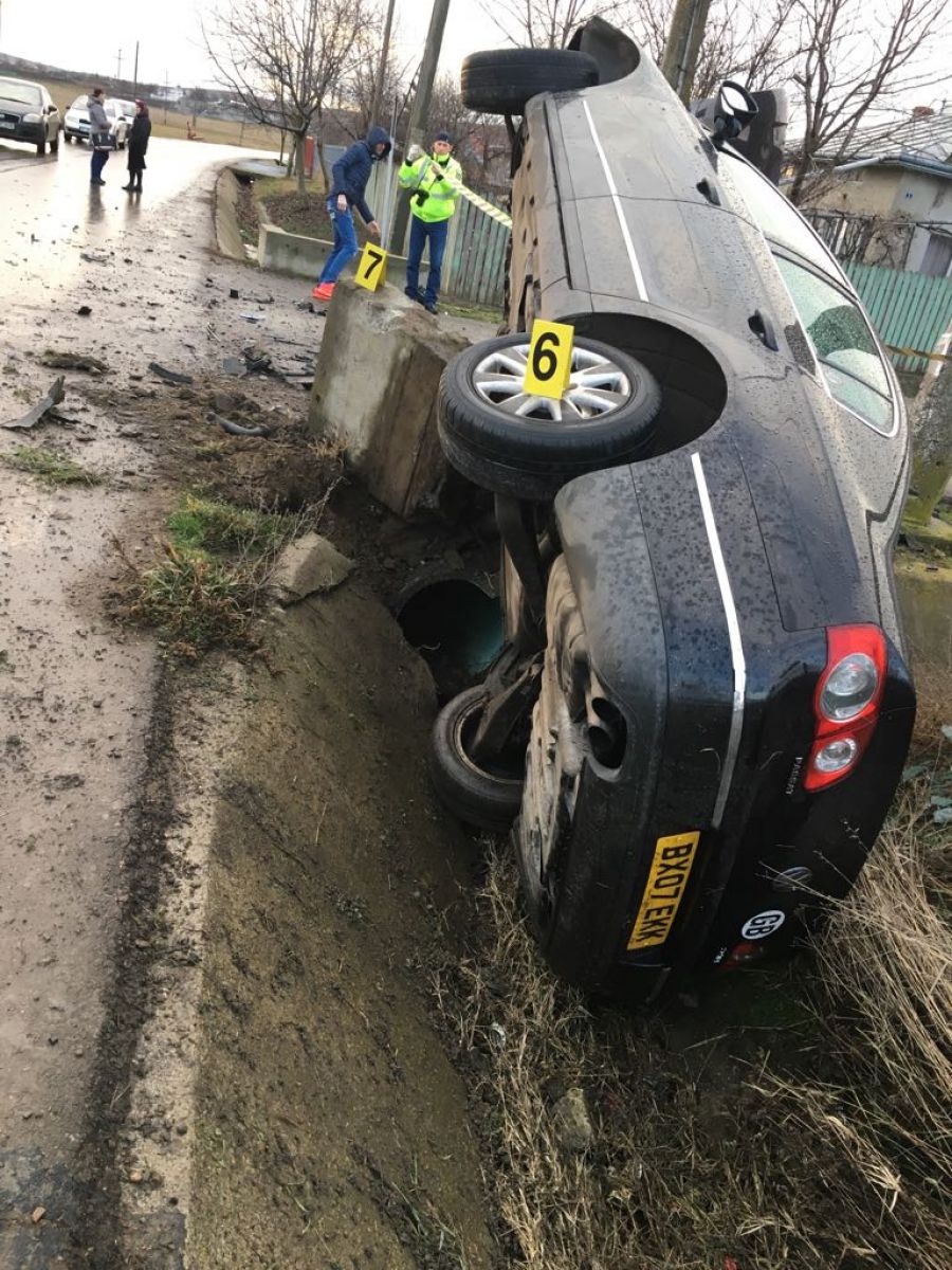 Automobilul a ieșit de pe șosea, a lovit un cap de pod, terminându-și cursa cu roțile în sus, într-un șanț.