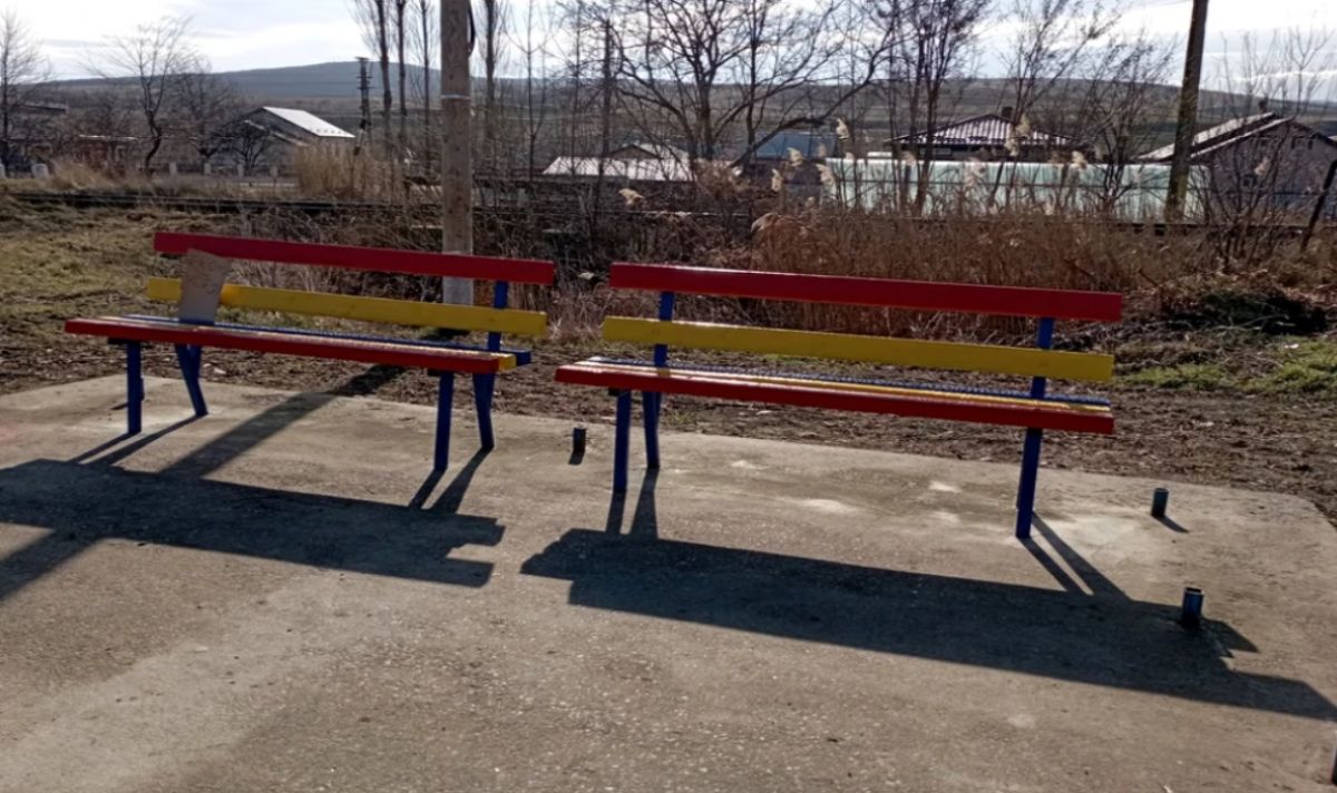 Multe gospodării aveau în față bănci improvizate care nu dădeau bine. Așa că au fost înlocuite cu unele „standard”, făcute pe cheltuiala primăriei. Mai nou, localnici s-au trezit cu bănci vopsite în tricolor în fața porții.