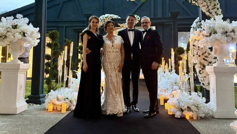 Mihai Albu, un apropiat al miresei, a distribuit pe rețelele sociale primele fotografii de la nuntă. Mihaela a îmbrăcat o rochie sirenă din dantelă, sofisticată și elegantă, iar Sorin Rap a ales un costum negru clasic, completat cu papion și o cămașă albă impecabilă.