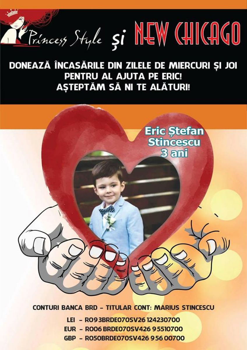 Cazul copilaşului grav bolnav a ajuns şi la urechile patronului clubului New Chicago, din incinta Uvertura Mall, care va dona toate încasările din zilele de miercuri şi joi pentru Eric. În această campanie umanitară s-a alăturat şi salonul de înfrumuseţare Princess Style.