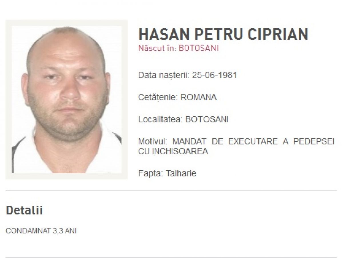Primul din lista ”infractorilor” este Ciprian Petru Hasan, născut la data de 25 iunie 1981, în județul Botoșani. Bărbatul este dat în urmărire după ce a fost emis un mandat de executare a pedepsei cu închisoarea pentru infracțiunea de tâlhărie. El are o condamnare de trei ani și trei luni. George Marius Popovici, cel de-al doilea tânăr din Botoșani, în vârstă de 25 de ani, este căutat de polițiști pentru comiterea infracțiunii de tâlhărie. Dacă va fi prins de oamenii legii, el va avea de executat trei ani și patru luni de închisoare.