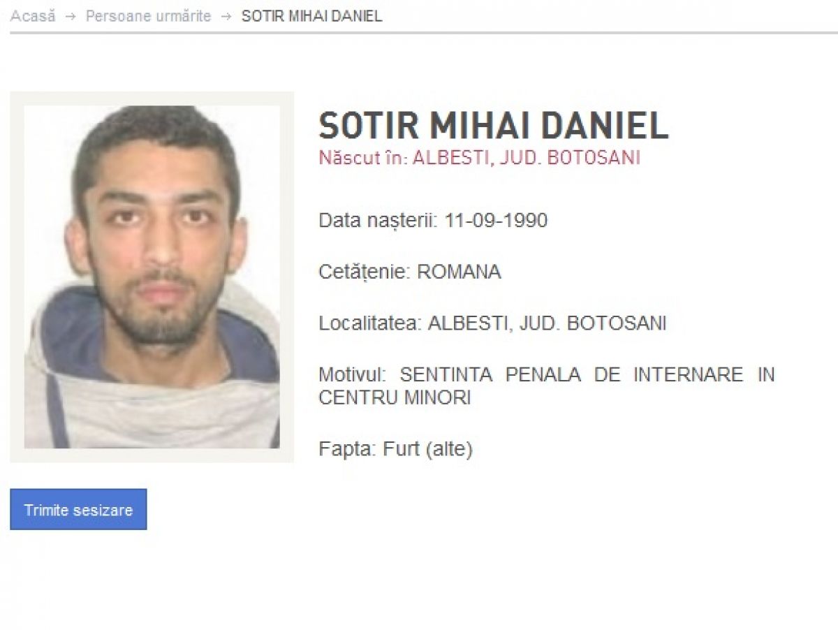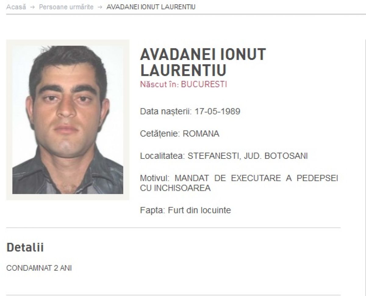 Ionuț Laurențiu Avadanei, de 26 de ani, din localitatea Ștefănești, județul Botoșani, a pus Poliția pe urmele lui, după ce a comis infracțiunea de furt din locuința. De altfel, pe numele său a fost emis și un mandat de executare a pedepsei cu închisoarea. Ultimul din lista persoanelor urmărire este Mihai Daniel Sotir, născut în comuna Albești, județul Botoșani. Motivul pentru care este dat în urmărire este acela că, pe numele său a fost dată o sentință penal de ”internare în centru de minori”, se arată pe site-ul Poliției Române.