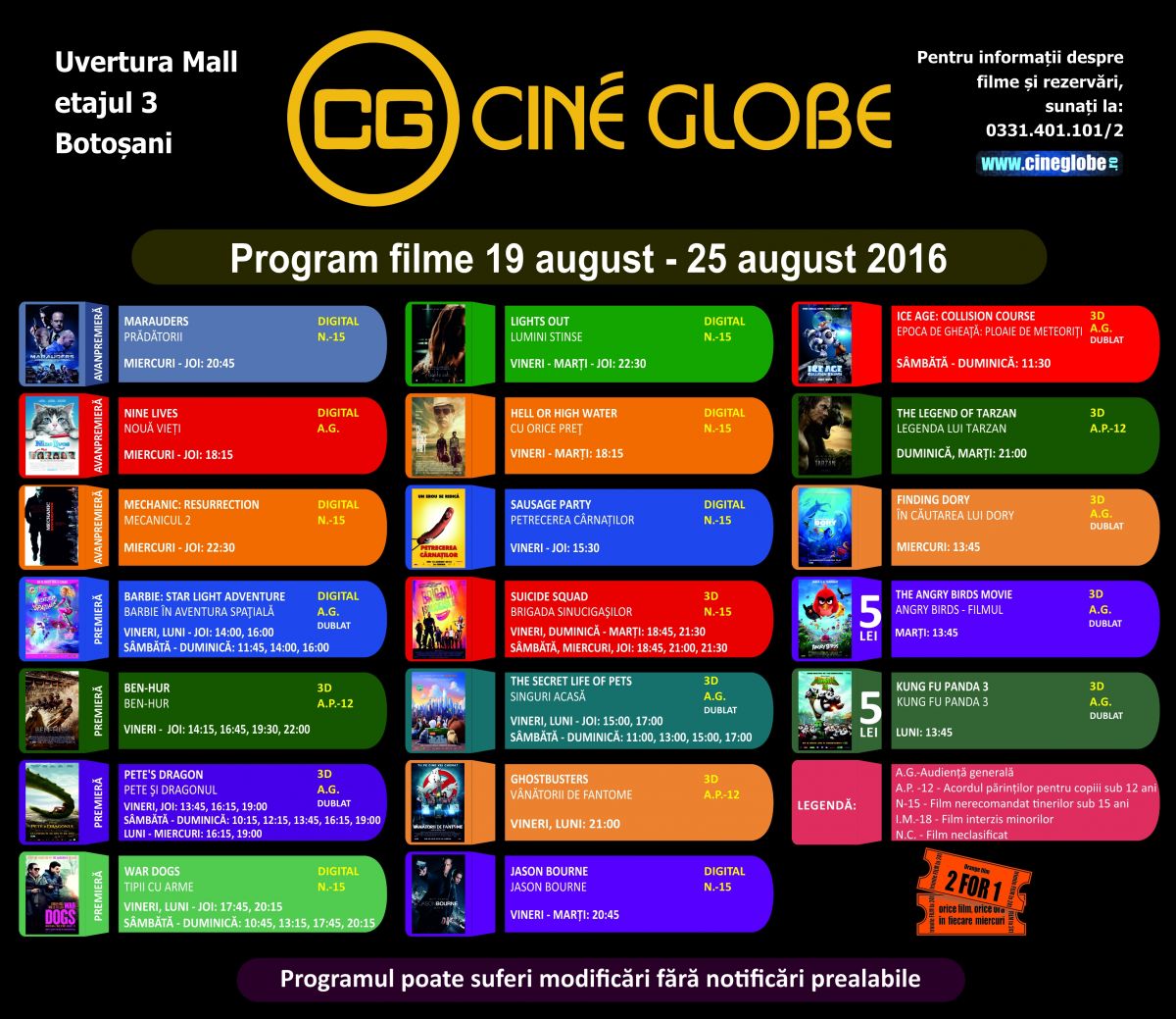 Trei avanpremiere vor rula pe marile ecrane ale multiplexului din incinta Uvertura Mall în perioada 19 -25 august 2016. Cinefilii botoșăneni au ocazia să urmărească câteva filme pline de acţiune şi comedie.