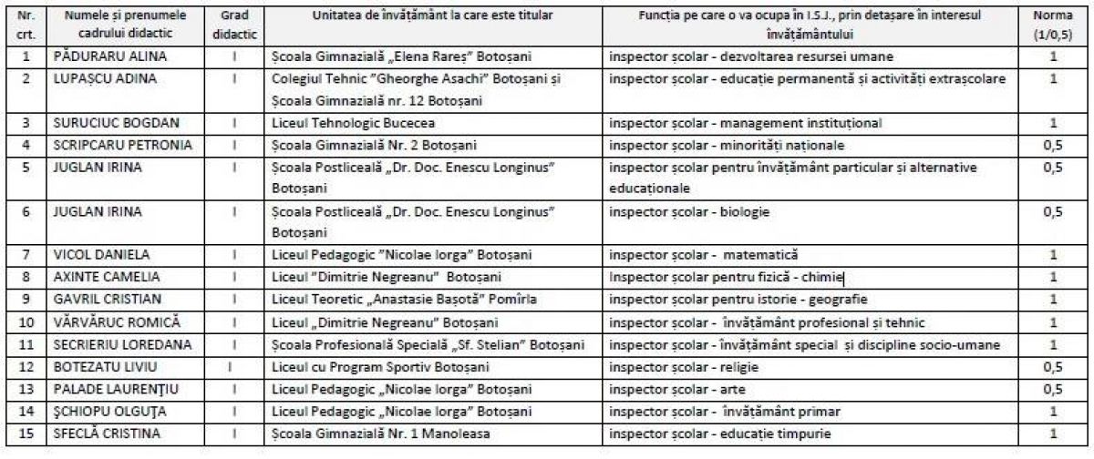 În schema de personal a inspectorilor din cadrul Inspectoratului Școlar Județean apar patru nume noi și anume: