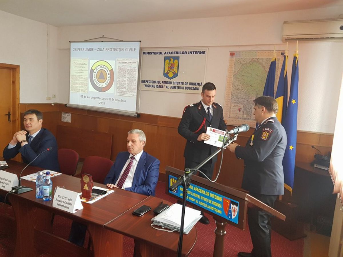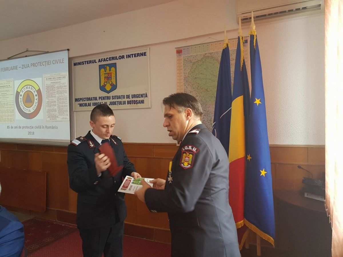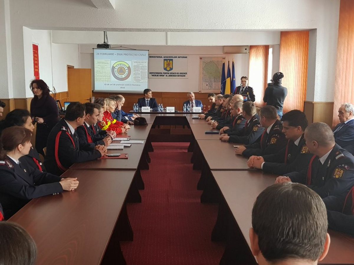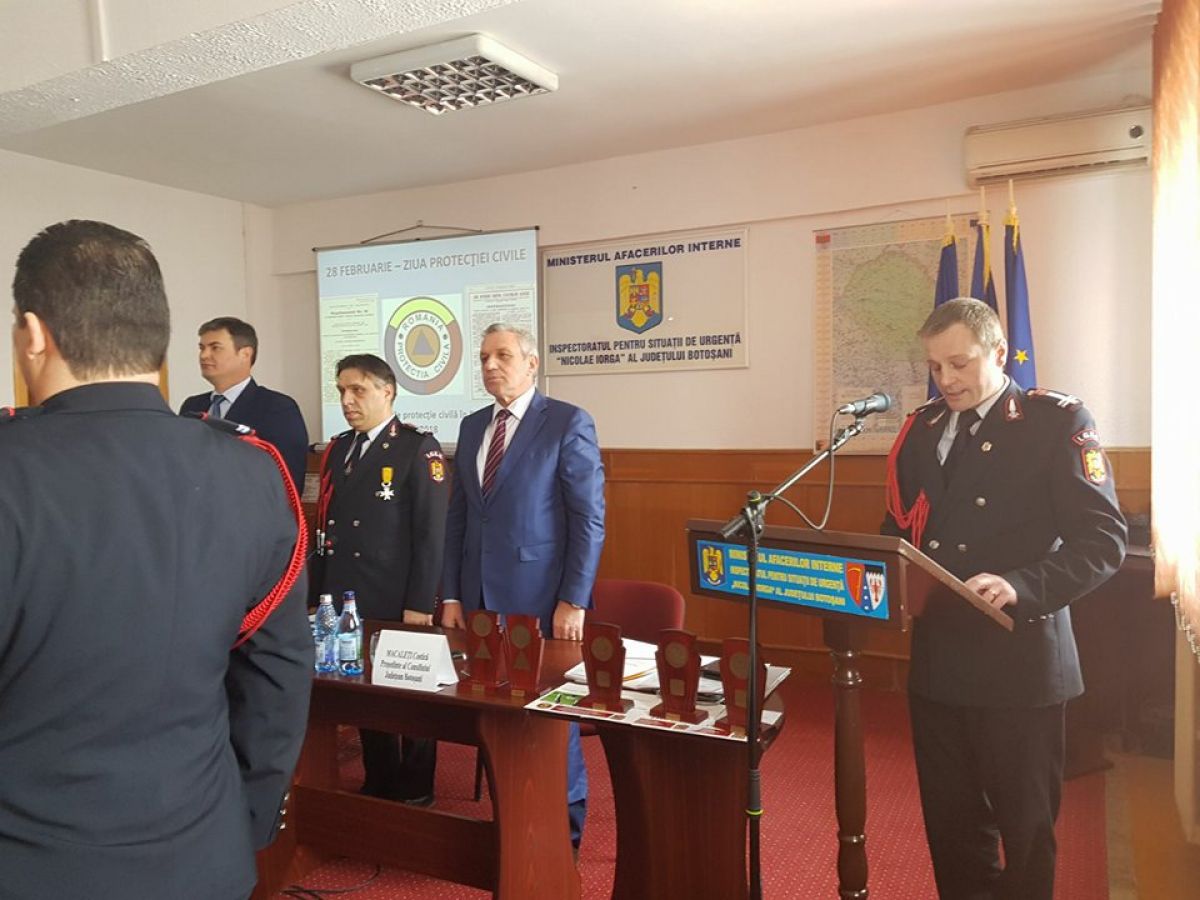 Angajaţii Inspectoratului pentru Situaţii de Urgenţă “Nicolae Iorga” al Judeţului Botoşani au marcat, astăzi, 85 de ani de la înfiinţarea Protecţiei Civile în România.