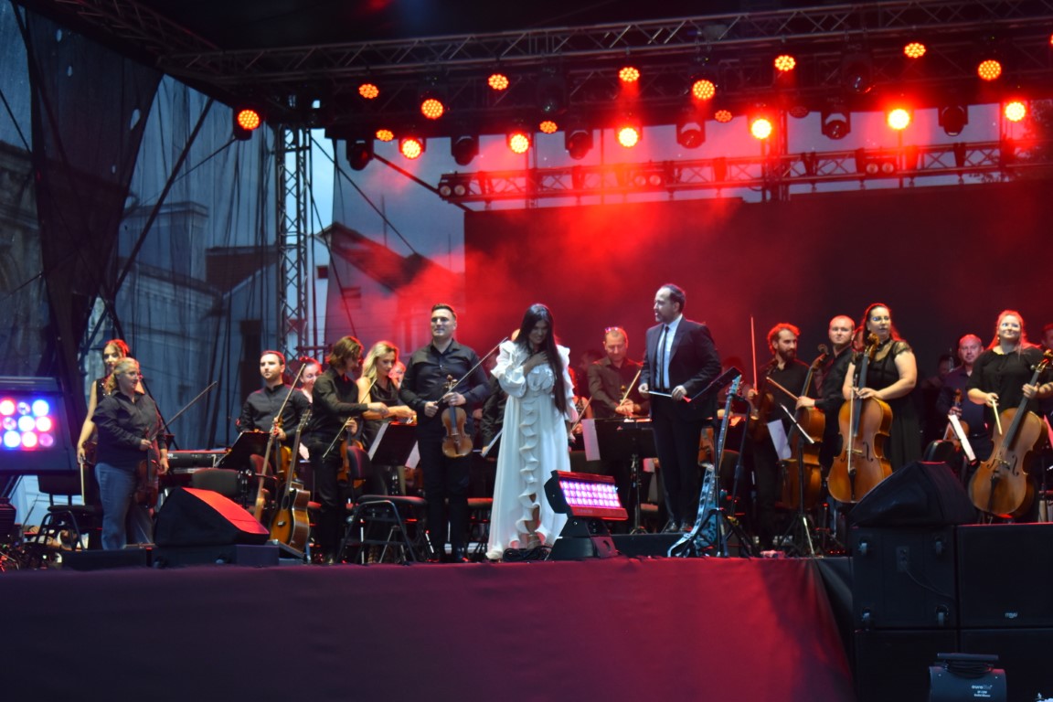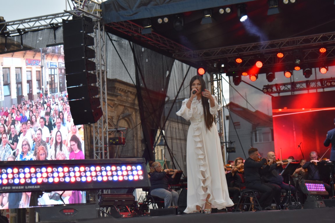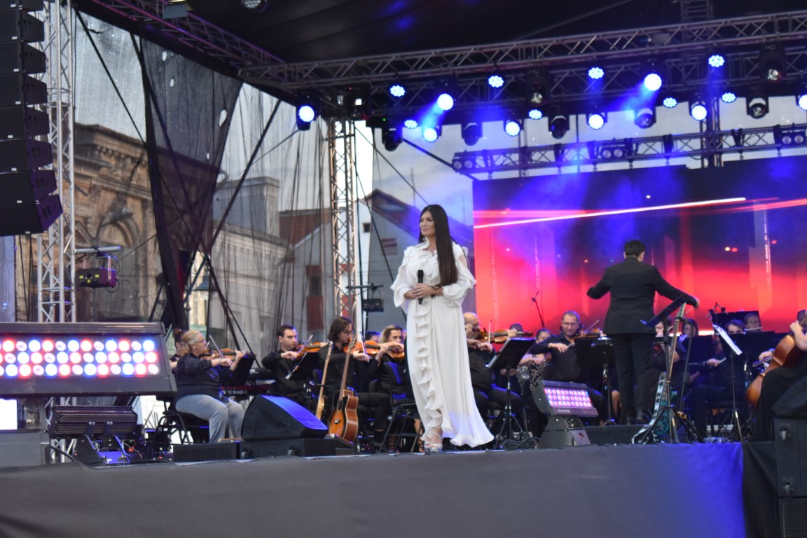 „O să vă propunem să vă cântăm un cântec alături deFilarmonica George Enescu din Botoșani, de inspirație folclorică. A ieșit foarte frumos la repetiții, sunt încântată și onorată să cânt alături de așa mari muzicieni așa că o să vă rugăm să cântați cu noi. Hai, române se numește, vă mulțumim”,