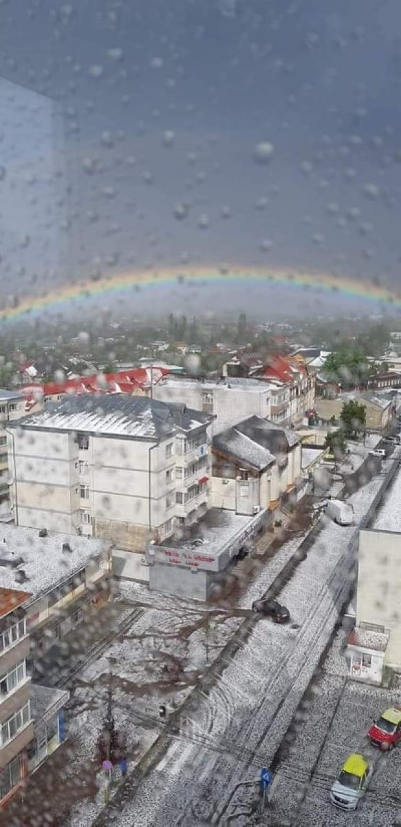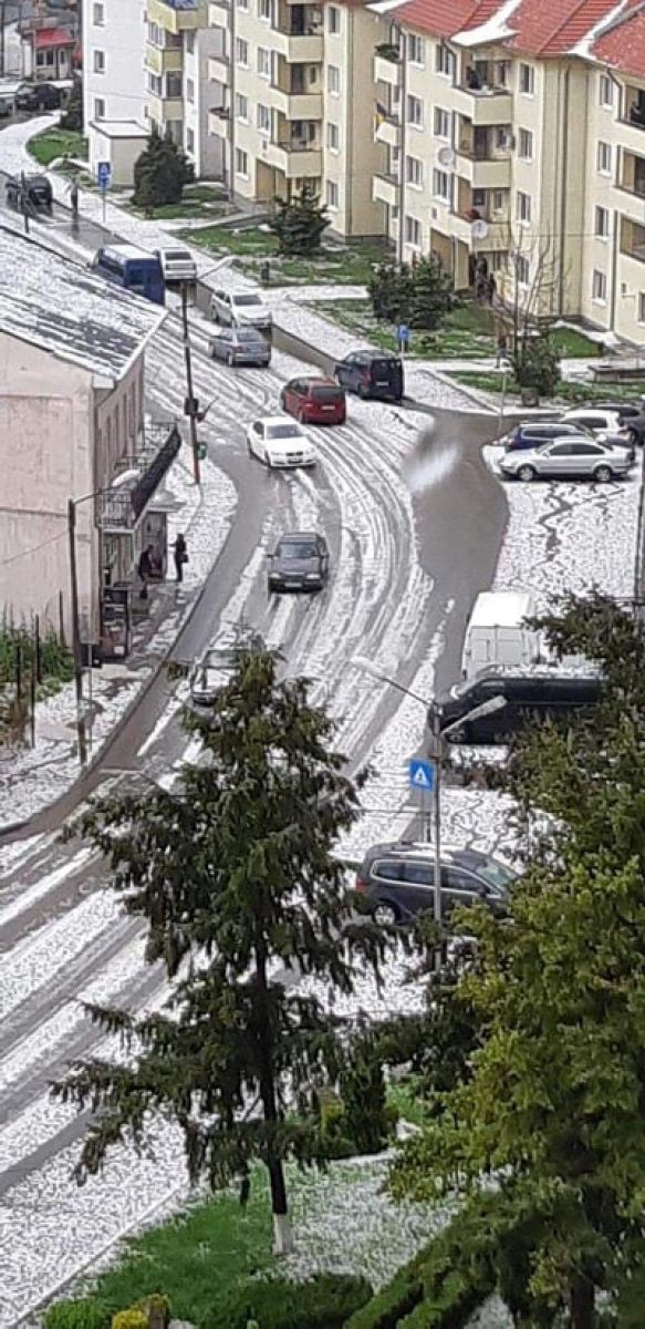 O vijelie puternică, însoţită de o ploaie cu grindină a lovit oraşul Dorohoi, judeţul Botoşani, aşternând un peisaj de iarnă veritabilă, un strat gros de gheaţă acoperind oraşul.