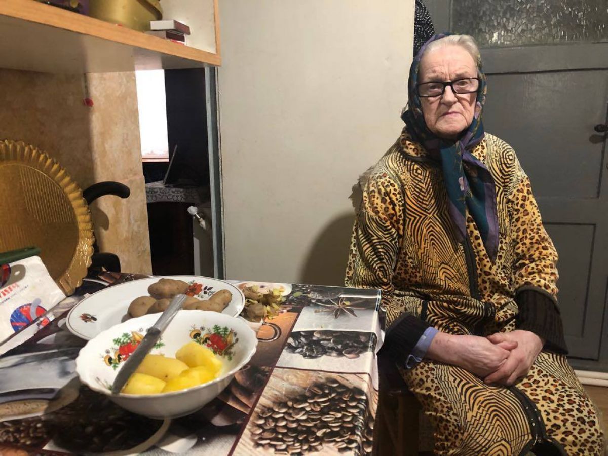 Am găsit-o pe Adela Gavrilă în spatele casei, curățând cartofi. Are 80 de ani și suferă de diabet, hernie de disc, iar în urmă cu câțiva ani a suferit și o paralizie pe o parte din corp. Își pregătea o salată din cartofi fierți, căci cu diabetul, este foarte greu cu mâncarea, după spusele ei.