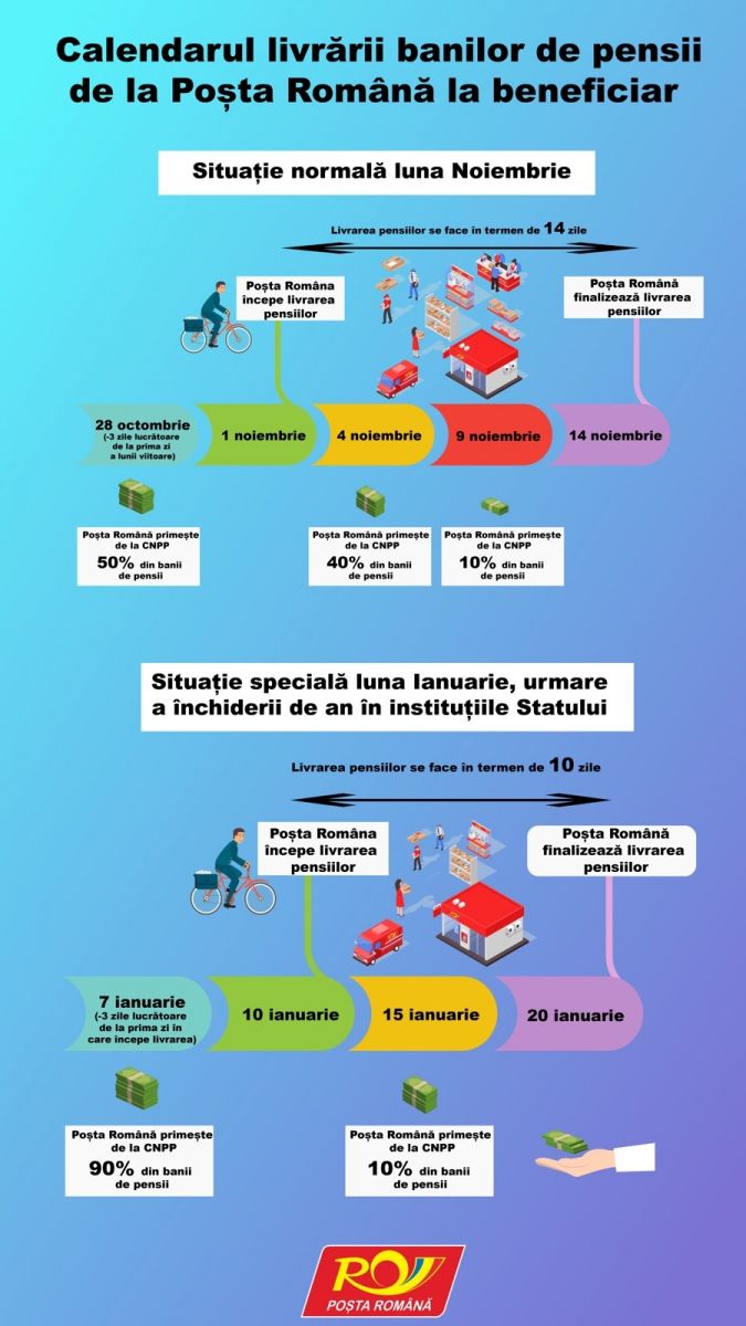 "Într-o lună obişnuită, Poşta Română primeşte prima parte a banilor de pensii cu 3 zile înainte de prima zi lucrătoare a lunii în care pensiile sunt livrate. Ca la orice început de an, partenerii noştri de la Casa Naţională de Pensii Publice virează Poştei Române prima tranşă a banilor începând cu 7 ianuarie, întrucât are loc închiderea de an, când se trage linie închizându-se creditele bugetare. Transformarea acestora în cash şi distribuirea în genţile fiecărui factor poştal durează aproximativ 3 zile. Astfel, pensiile vor fi livrate începând cu 10 ianuarie, într-un interval de 10 zile", menționează sursa citată.
