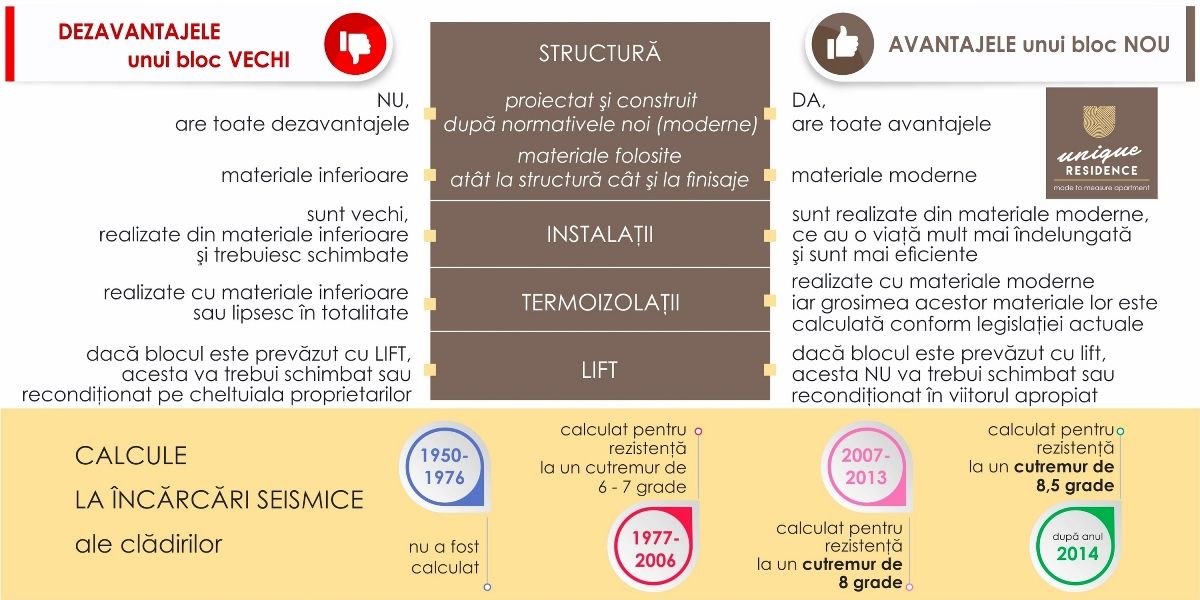 Pe de altă parte, înțelegem că, pentru construcțiile noi, normativele tehnice în vigoare sunt mult peste cele utilizate în realizarea celor vechi, iar soluțiile de proiectare, materialele structurale cât și cele folosite pentru izolare fonică, termică, hidrofugă, protecție la foc sunt actuale și fiecare dintre acestea respectă normele în vigoare.