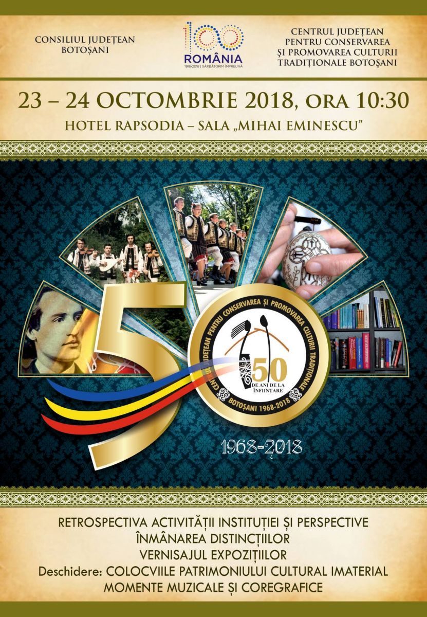 Centrul Judeţean pentru Conservarea şi Promovarea Culturii Traditionale Botoşani, instituţie de cultură aflată în subordinea Consiliului Judeţean Botoşani, organizează în data de 23 octombrie 2018, ora 10.30, manifestarea prilejuită de aniversarea a 50 de ani de la înfiinţarea instituţiei, aniversare ce stă sub semnul responsabilităţii, profesionalismului şi al tradiţiei.