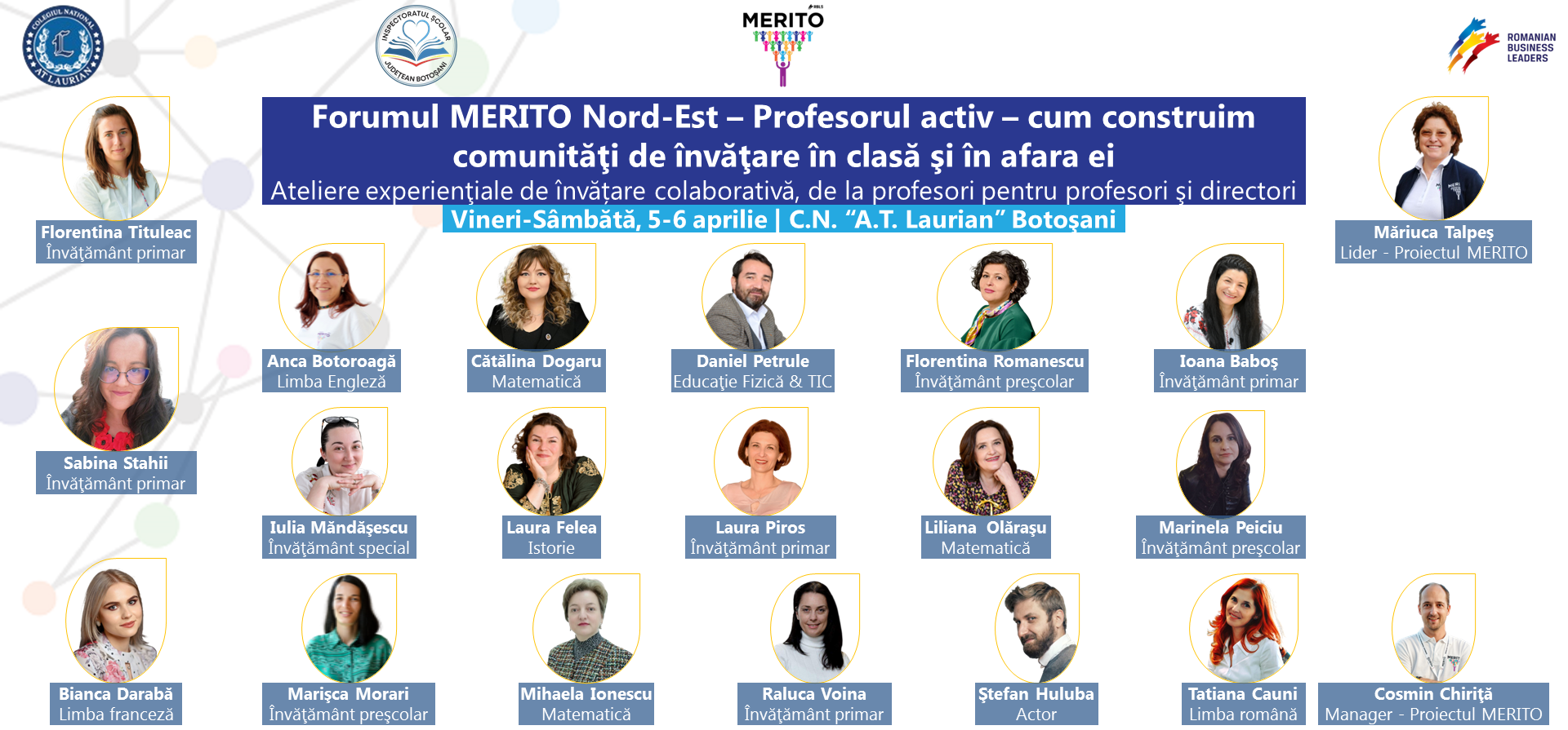 Pe 5-6 aprilie, peste 150 de profesori şi directori, din regiunea Moldovei şi din ţară, sunt invitaţi să participe gratuit la a prima ediţie a Forumului Merito Nord-Est, cu tema „Profesorul-activ - cum construim comunităţi de învăţare în clasă şi în afara ei", cu ateliere experienţiale gratuite de învăţare colaborativă, facilitate voluntar de 15 profesori şi specialişti din comunitatea Merito. Evenimentul se va desfăşura fizic, pentru prima oară în Botoşani, la Colegiul Naţional „A.T. Laurian”.