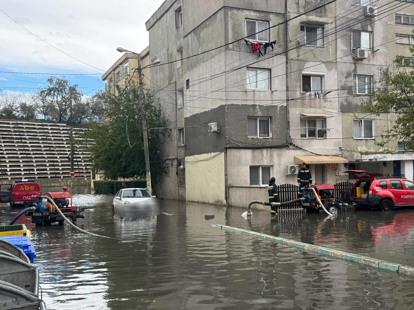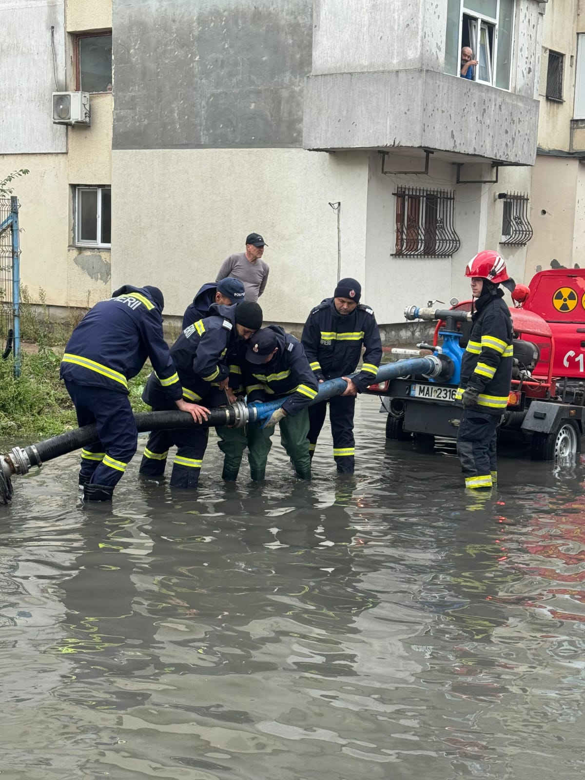 - evacuarea apei care s-a acumulat pe căile de acces către blocuri, în orașul Năvodari.