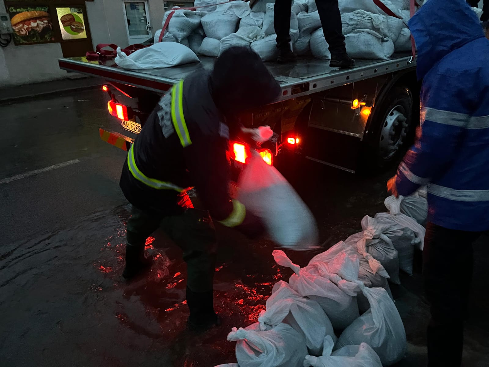 - încărcarea și amplasarea sacilor de nisip, urmată de constituirea a două diguri temporare pe străzile Râsuri și Poporului;