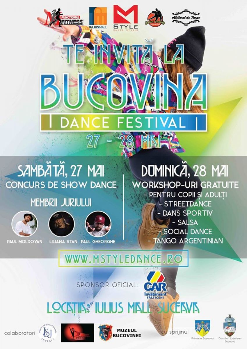 Sâmbătă și duminică, pe 27 și 28 mai 2017, sucevenii și nu numai primesc o invitație la dans. Bucovina Dance Festival este primul eveniment de amploare dedicat dansului, din Suceava, organizat de M Style Dance Studio și Iulius Mall. Gândit sub forma unei competiții, dar și a unui spectacol coregrafic complet, Bucovina Dance Festival reunește la Iulius Mall, timp de două zile, sute de dansatori începători sau profesioniști, trupe, instructori și simpli curioși, care împart aceeași pasiune pentru ritm și muzică.