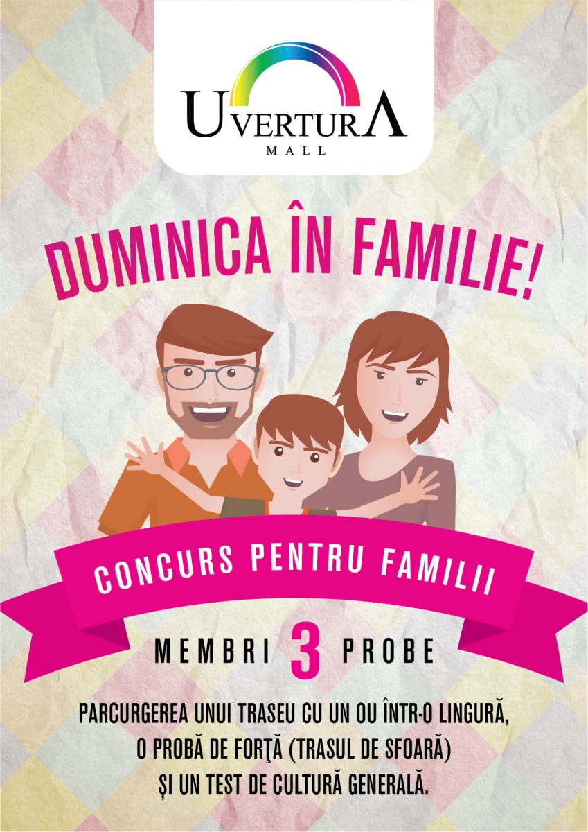 De la ora 16:00 se dă startul unui concurs destinat familiilor – ”Duminica în familie”, un concurs ce își propune să implice trei membri din fiecare familie în probe haioase, menite să aducă zâmbetul pe buzele tuturor, dar în același timp sunt probe care pun la încercare abilitățile, îndemânarea și cultura generală a participanților. La finalul concursului, eforturile primelor 3 familii vor fi răsplătite cu 3 premii în valoare totală de 800 lei. Uvertura Mall- Ne vedem în centru!