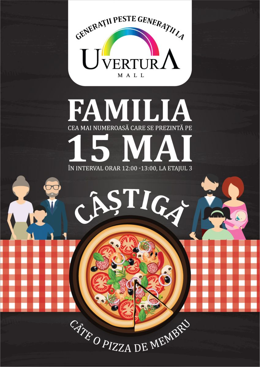”Pentru cei care se mândresc cu un arbore genealogic impresionant am pregătit un eveniment inedit – ”Generații peste Generații la Mall”. Cei care se prezintă în intervalul orar 12:00-13:00 și fac dovada gradului de rudenie pe o singură linie (maternă sau paternă) și se vor departaja ca fiind familia cea mai numeroasă, vor primi din partea Uvertura Mall câte o pizza de nume”