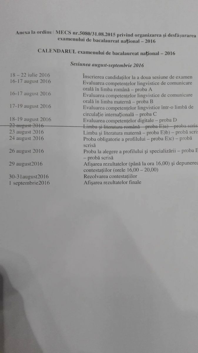 Probele scrise ale celei de-a doua sesiuni a bacalaureatului vor începe pe 22 august cu Limba si literatura romana si se vor încheia pe 26 august cu proba la alegere a profilului si specializarii.