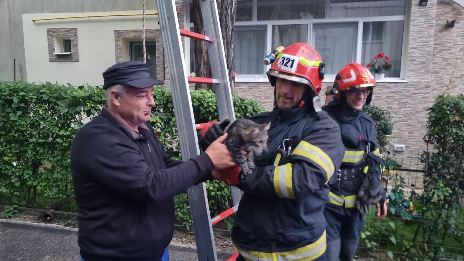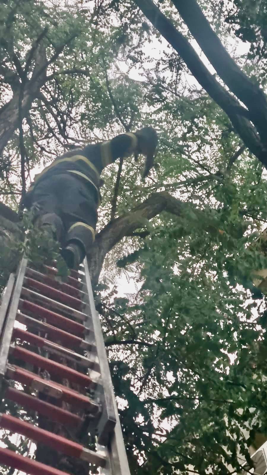 Folosind o scară, unul dintre pompieri a urcat până aproape de vârful copacului și a reușit să coboare pisica în siguranță. Aceasta a fost predată înapoi stăpânului ei.