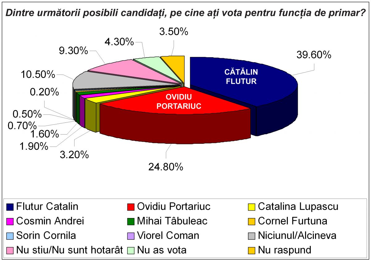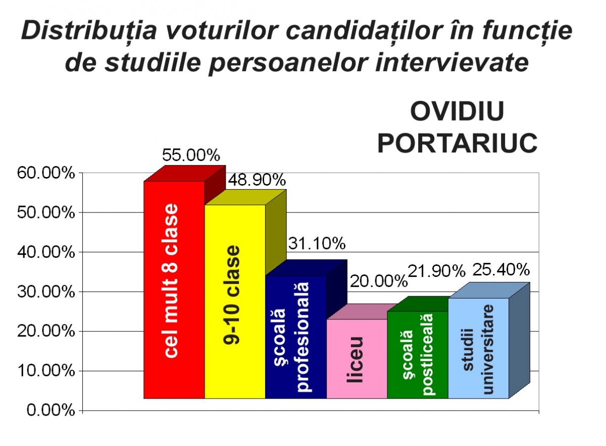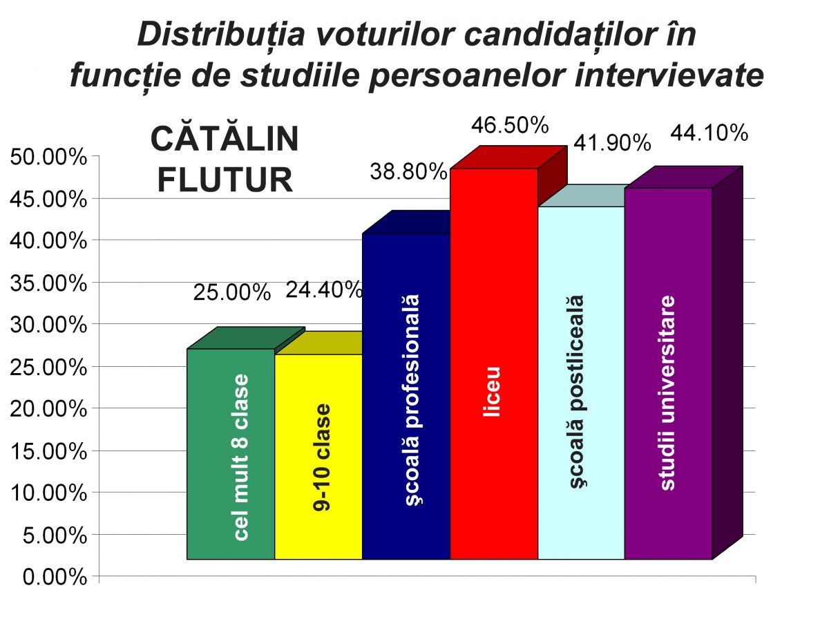 Totodată, sondajul a măsurat şi distribuţia voturilor fiecărui candidat, în funcţie de nivelul de şcolaritate al votanţilor. După cum se poate observa din graficele ataşate, Cătălin Flutur este candidatul favorit al votanţilor cu studii liceale, postliceale sau universitare, pe când Ovidiu Portariuc este preferat în special de categoriile de votanţi cu cel mult zece clase absolvite. Sondajul a fost comandat de PNL şi a fost realizat în perioada 04-12 ianuarie 2016, pe un eşantion de 806 persoane, cu o marjă de eroare calculată de ±3,4%.