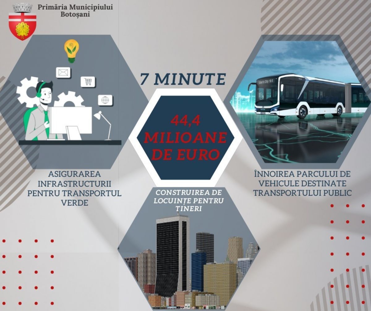 -Înnoirea parcului de vehicule destinate transportului public (achiziția de vehicule nepoluante), prin proiectul „Modernizarea transportului public la nivelul Zonei Urbane Funcționale a Municipiului Botoșani – Comuna Curtești – Comuna Bălușeni, prin achiziția de vehicule ecologice pentru transportul public”- 34,6 milioane de euro. Se vor achiziționa 50 mijloace de transport verde.