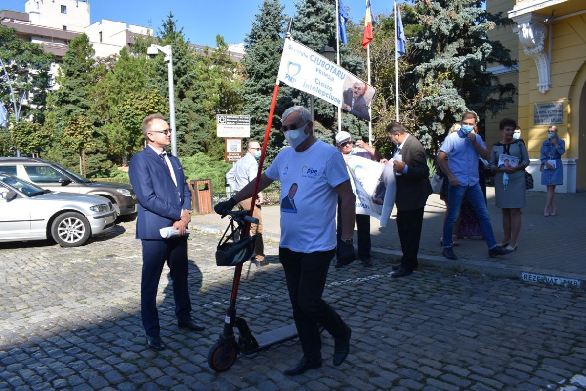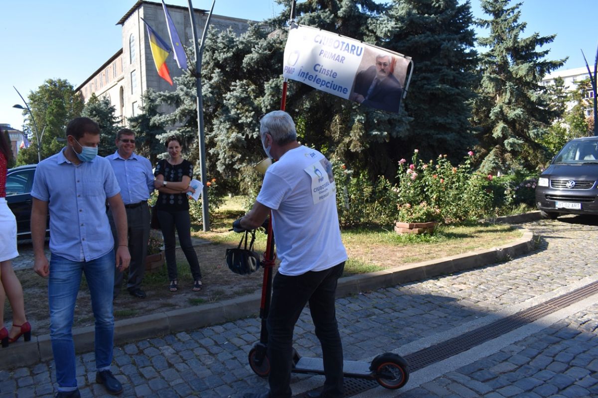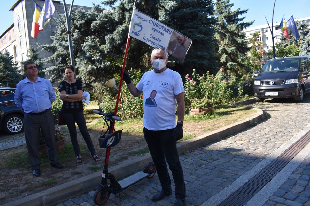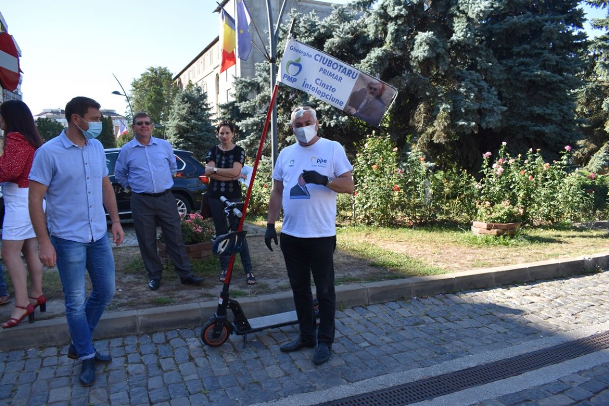 Aspirantul Partidului Mișcarea Populară la funcția de primar al municipiului Botoșani a venit cu trotineta electrică la prezentarea candidaților formațiunii la alegerile locale.