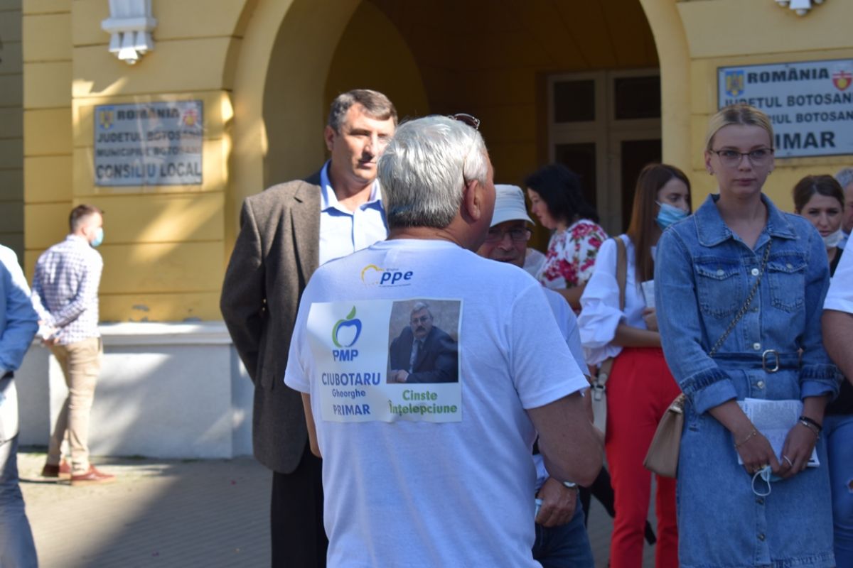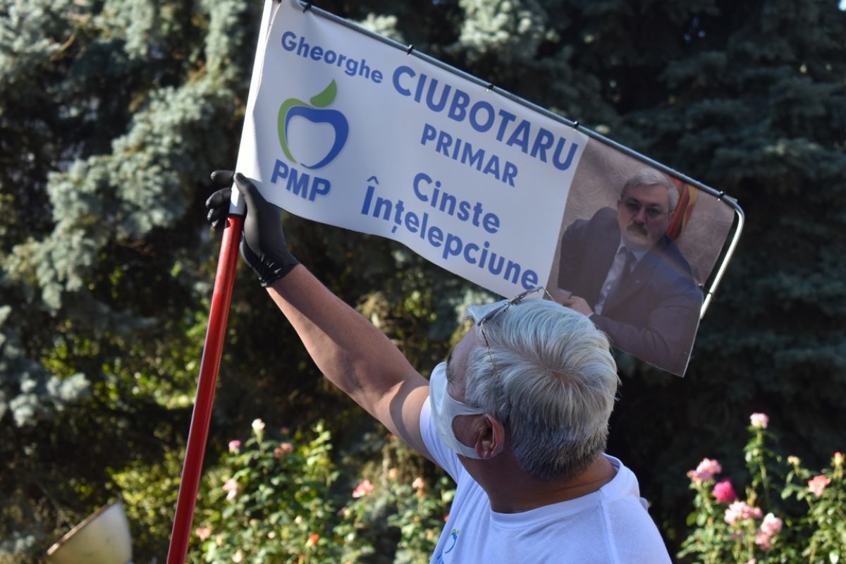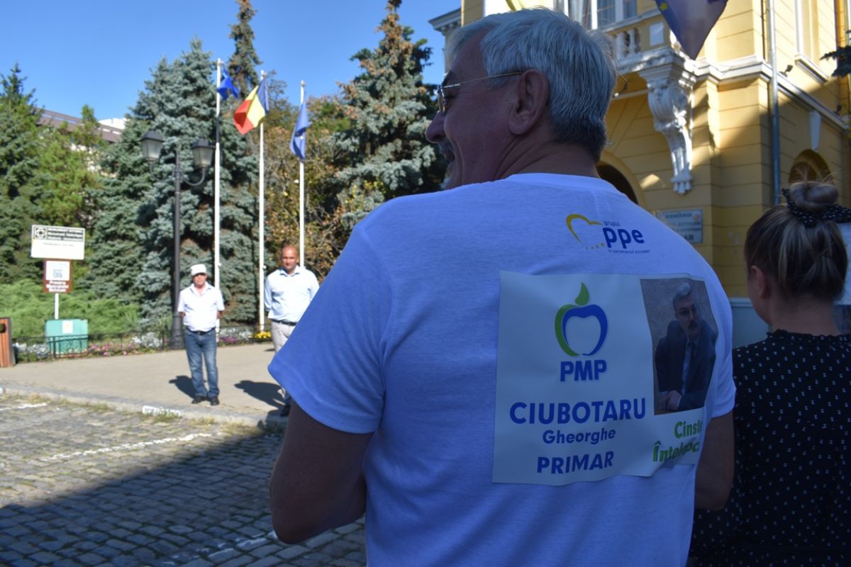 Dar acesta nu a fost singurul element distinctiv al lui Gheorghe Ciubotaru. Ex-liberalul a îmbrăcat un tricou alb care pe față avea imprimat afișul de campanie al lui Corneliu Popescu, intrat în cursa pentru președinția Consiliului Județean, iar pe spate avea lipit posterul său de candidat.