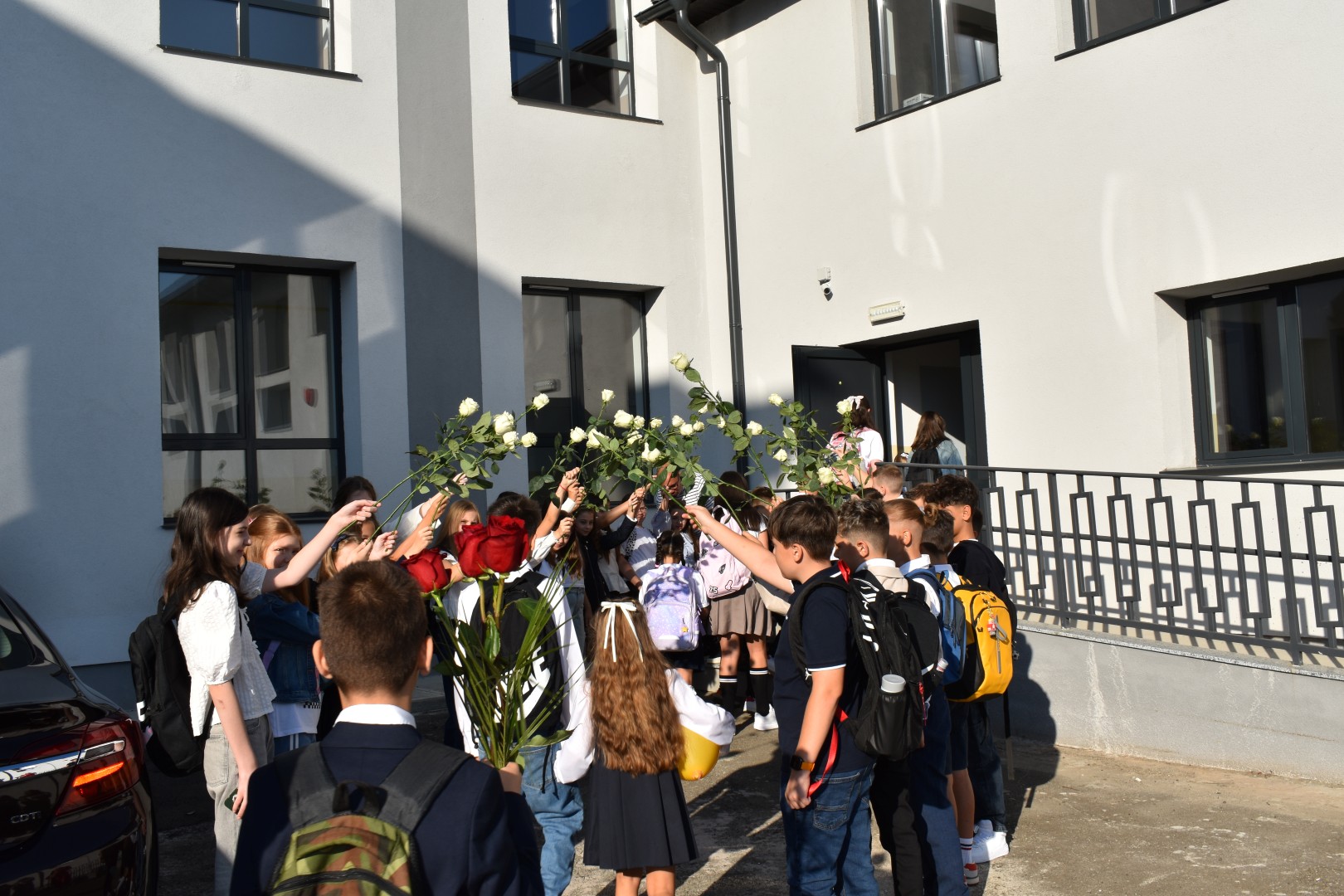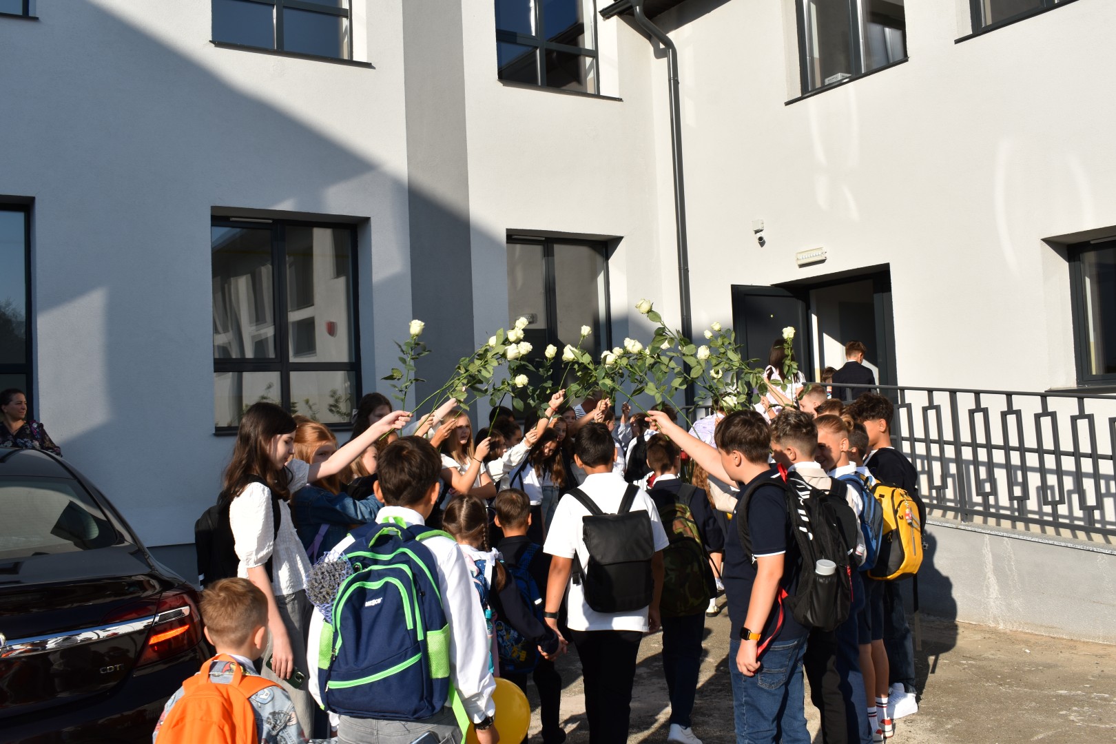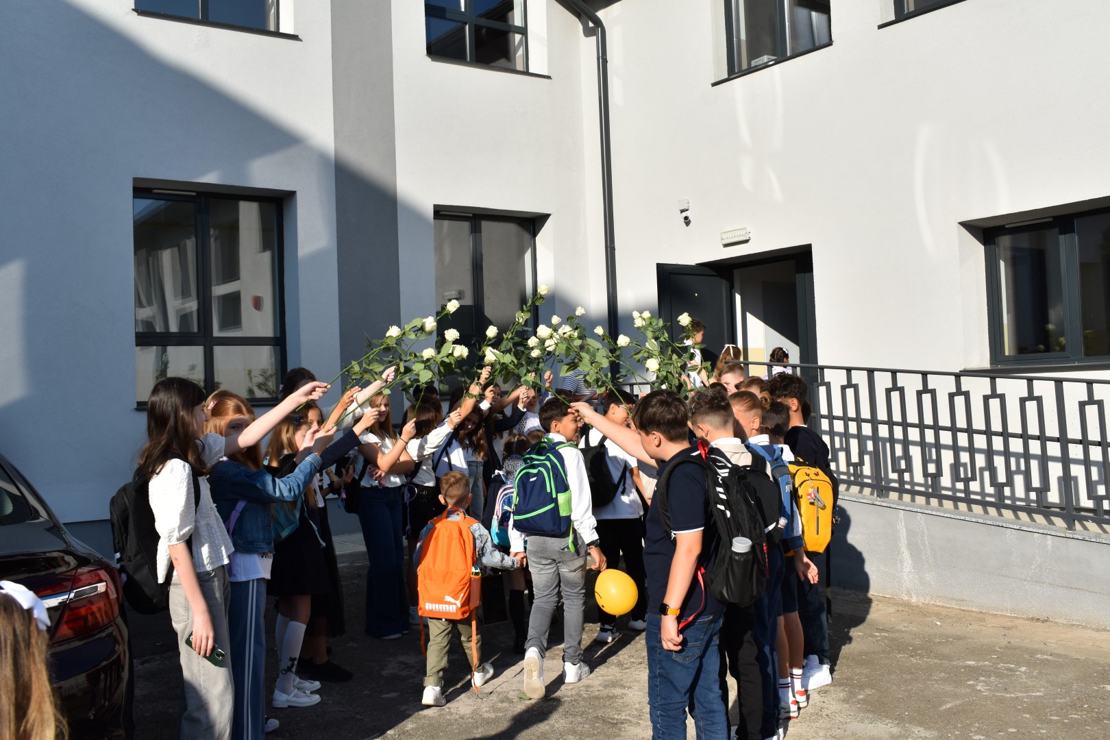 Un moment emoționant a fost podul de flori format special pentru cei peste 100 de elevi de la clasa pregătitoare, la intrarea în școală.