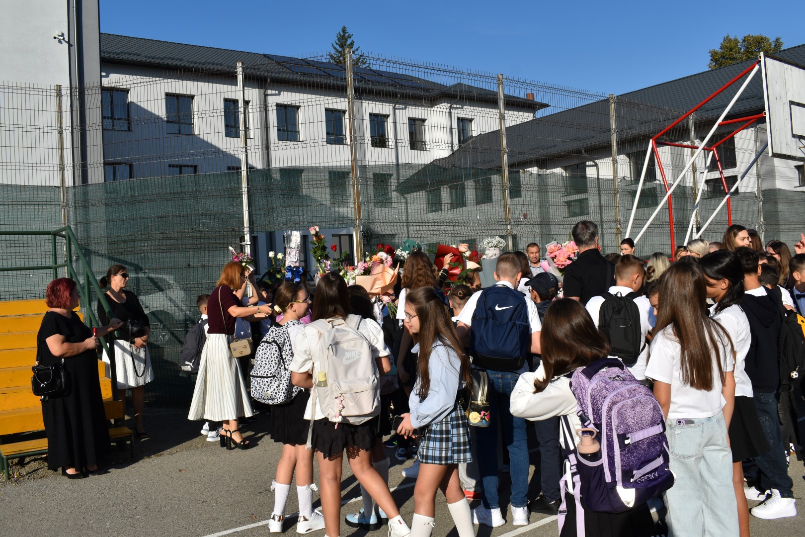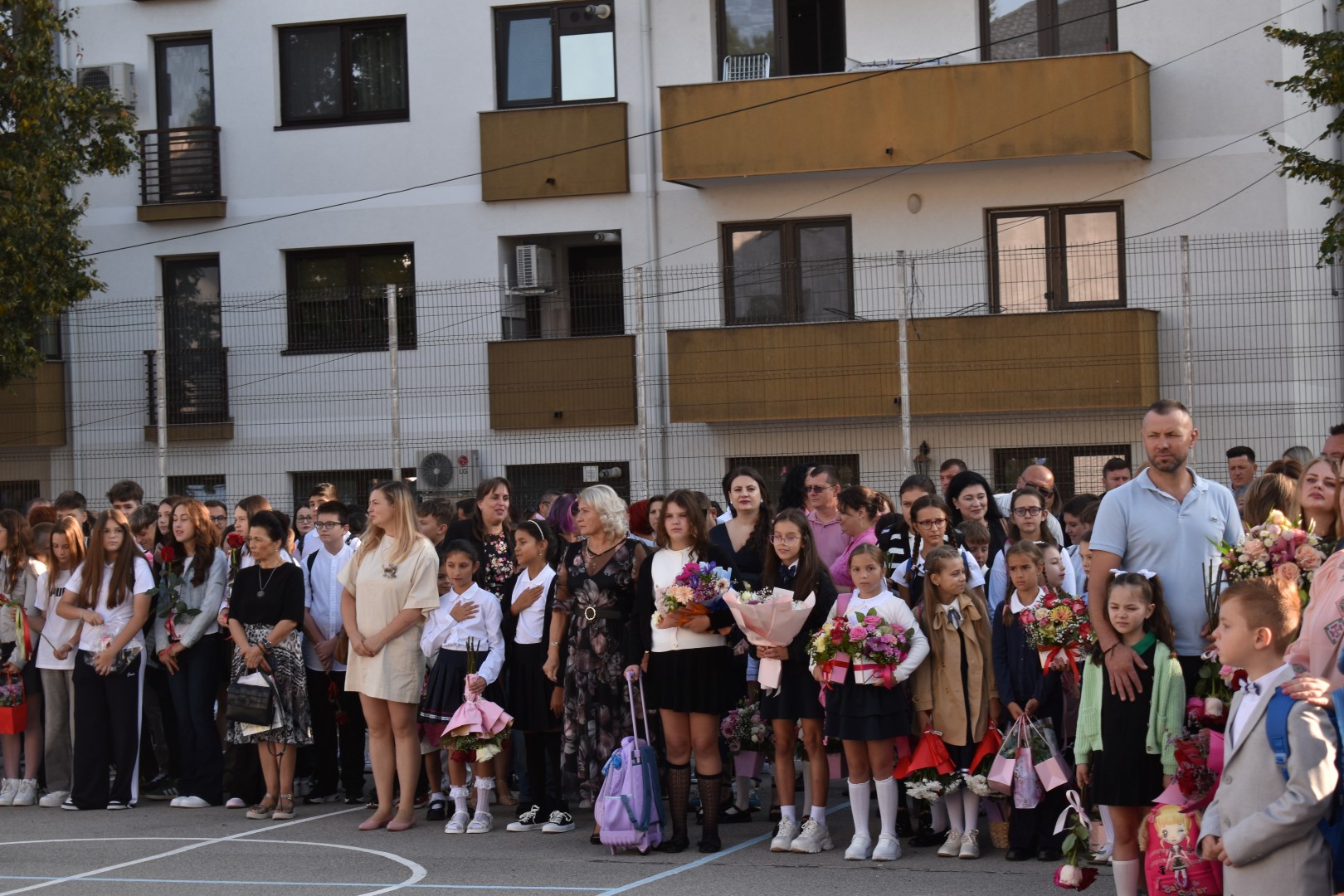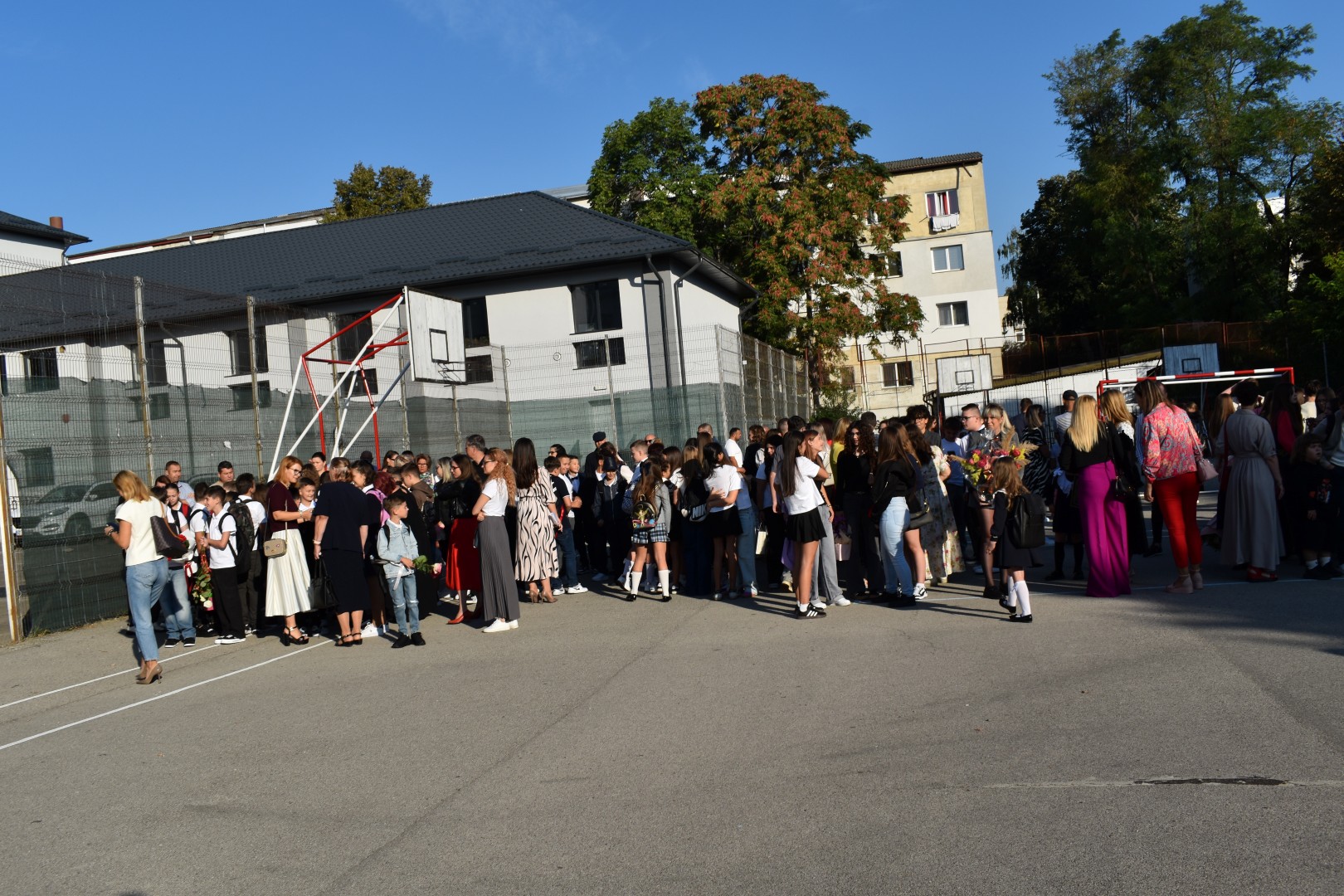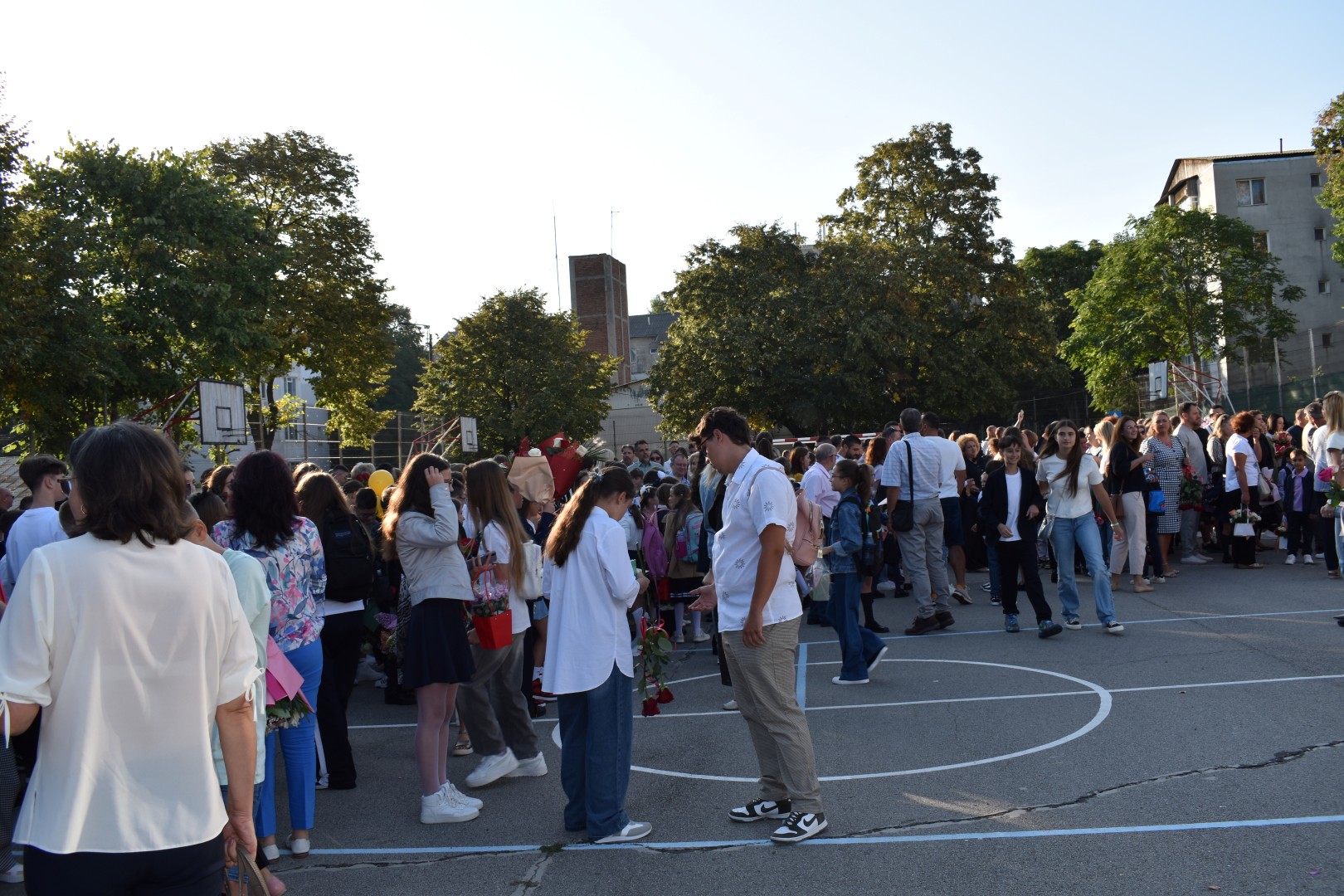 Festivitatea de deschidere a noului an școlar a avut loc pe terenul de sport, acolo unde s-au adunat sute de elevi, părinți și bunici.