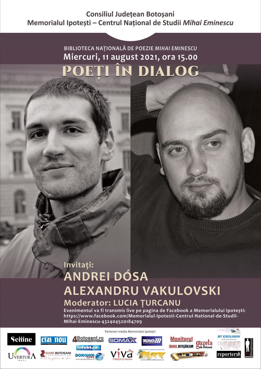 Pe data de 11 august 2021, la ora 15.00, Memorialul Ipotești – Centrul Național de Studii „Mihai Eminescu” organizează o nouă ediție a întâlnirilor Poeți în dialog, la care vor participa poeții Andrei Dósa și Alexandru Vakulovski. Discuția va fi moderată de Lucia Țurcanu.